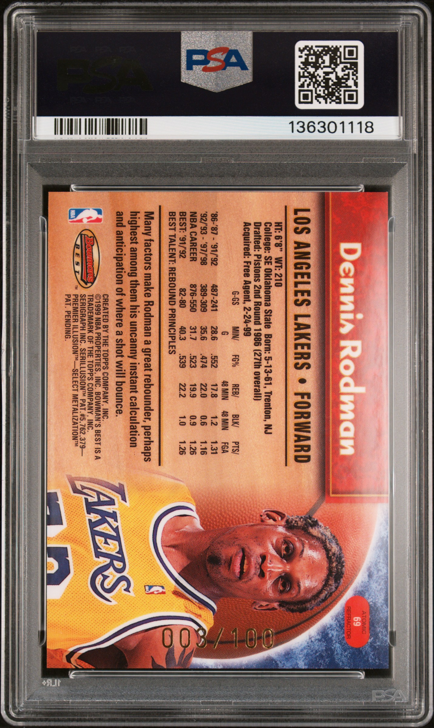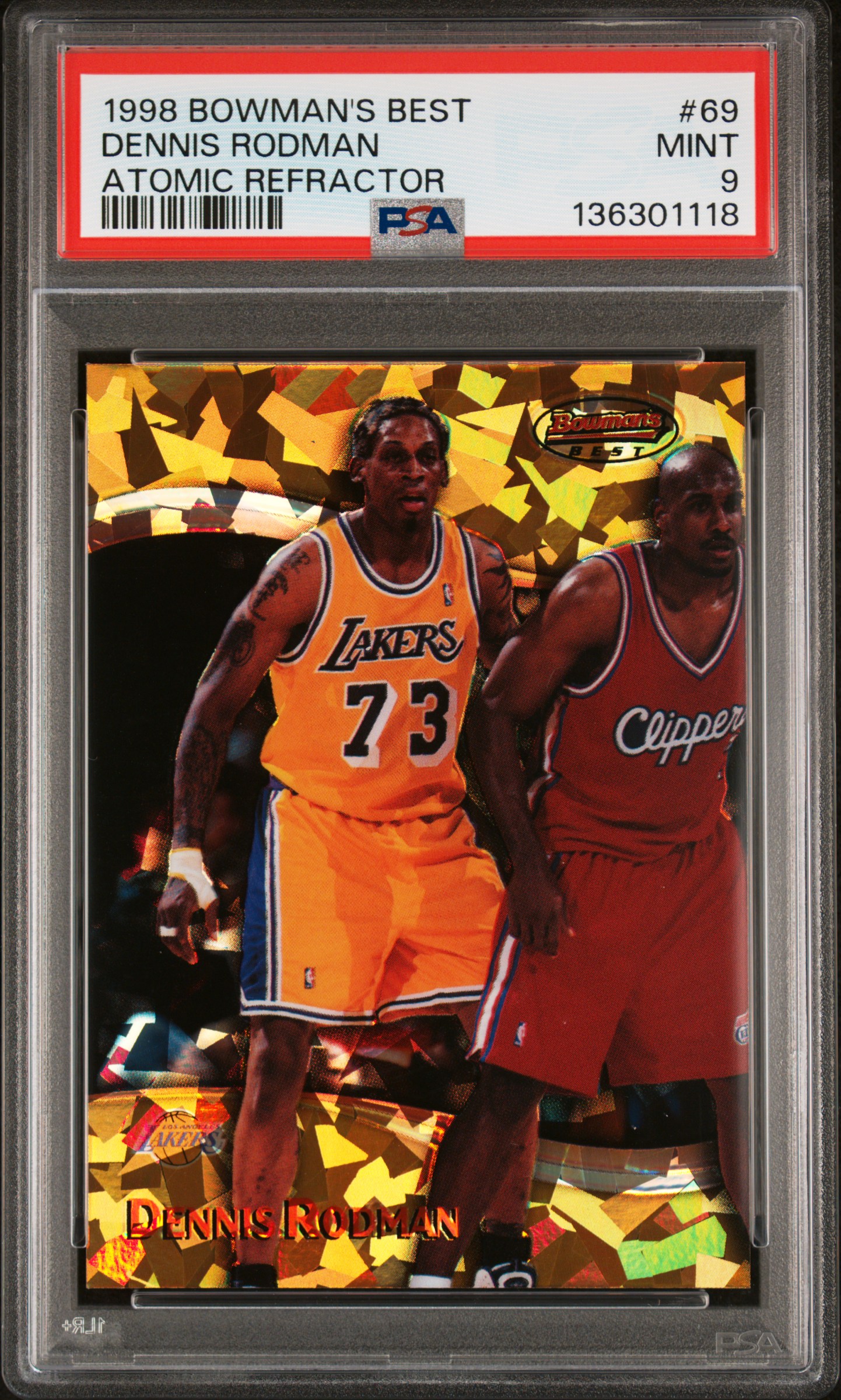 I started collecting basketball cards in the late 90s. I have just about every basketball card I've ever bought, whether it was pulled from a pack/box or won on an auction. I recently decided to grade and sell a few to fund the purchase of a card. This is my first time ever submitting cards to be graded, so I decided to send them in via a local PSA drop-off event on 10/31. Here is the first result I got back, a 1998 Bowman's Best Dennis Rodman Atomic Refractor, PSA 9, pop. 3 higher. I have a few more that should have the grades available late Dec. or early Jan. I'll update this post when those grades become available.