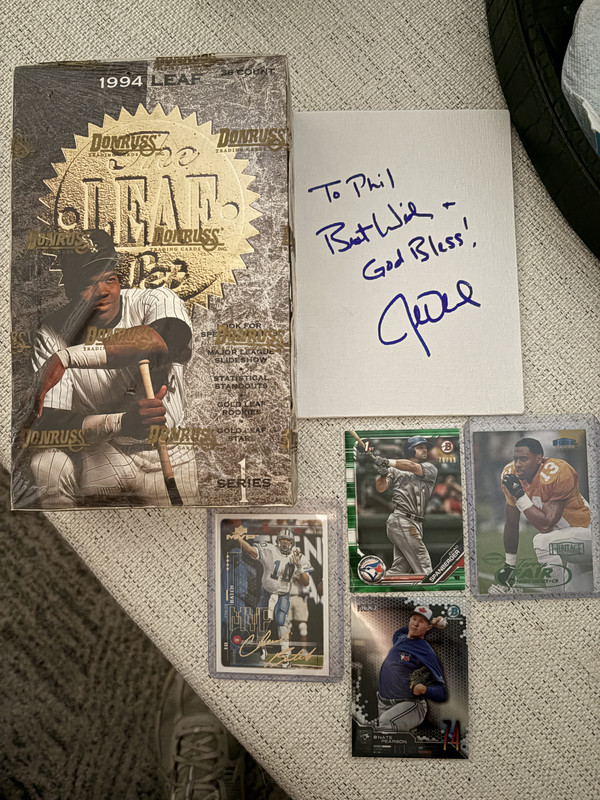 ![]() ![]() Asks were: Toronto Blue Jays, Detroit Lions, 90s focus, and junk wax for my tiktok/IG channel The singles include a Charlie Batch Gold Script #/100, a Terry Fair RC #/125, a green Spangberger #/99, and a Pearson refractor. LOVE 90s #d, so that was a ton of fun to open. I had specifically mentioned need either a Dave Stieb or John Olerud auto for my Blue Jays PC. Well package two was a personalized auto from Olerud! Signed on a really nice white canvas. Will get that framed up and hung on the man cave wall for sure. Amazing piece! Last was a box of 1994 Leaf. One of the most eye appealing base sets pre-1995, and some cool inserts inside. Will have a blast ripping through this! Santa crushed it!