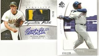 my bonus was 2005 Sp Authentic Tony Gwynn jersey card #d /199 Bv $10 my exquisite card is Signature Patch Huston Street #d /30 BV N/A Kind of surprised it doesnt have a bv... Any thoughts on what BV should be on it?