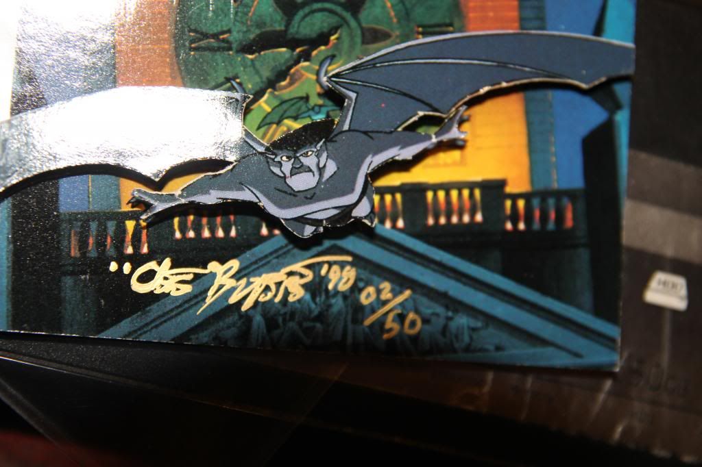 From looking at your photobucket and how your other scans look I'd be more of the mind this card is a multi-layerd card. It seems the top, or forward layer of the card, the gargoyle, is roughly cut out of another copy of the card #50 and then somehow attached to a second copy of the card, layering it up. Almost like a simple diorama. The visual on the gold autograph is pretty fuzzy. Perhaps a cell phone photo would even be better since scanners have such a shallow depth of field and even 1/16" off from the scanner bed is a massive distance, so this being 1/8" or more just gives a muddy result for detail like signature identification. There are two possible people associated with the show who have last names starting with a "B", but again hard to ID from the scan if the last name even starts with a "B". Considering the rest of the facts with the card I'd be much more of a mind that the card is a fan made piece sold for personal profit rather than something 'official' associated with the show, and the autograph is of that artist. If this was made by Skybox the cutout of the gargoyle probably would've been more professional. But a clearer image of the signature would help all around. But again, I've no first hand knowledge of these cards and just going on what I see. |