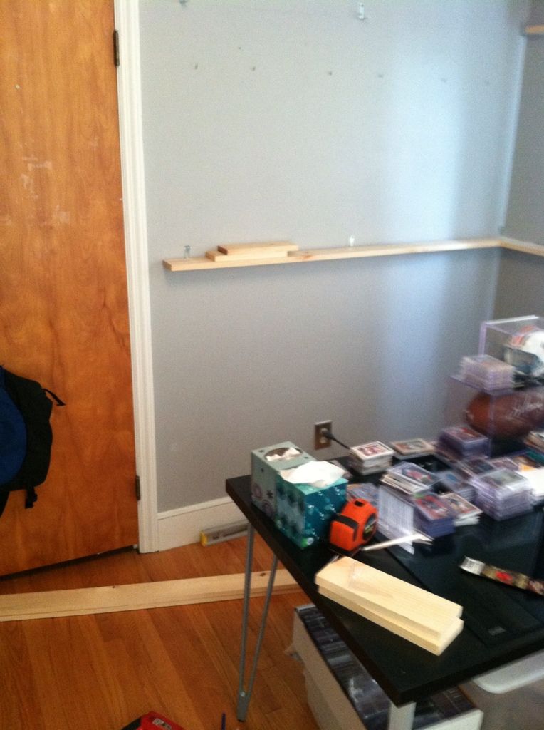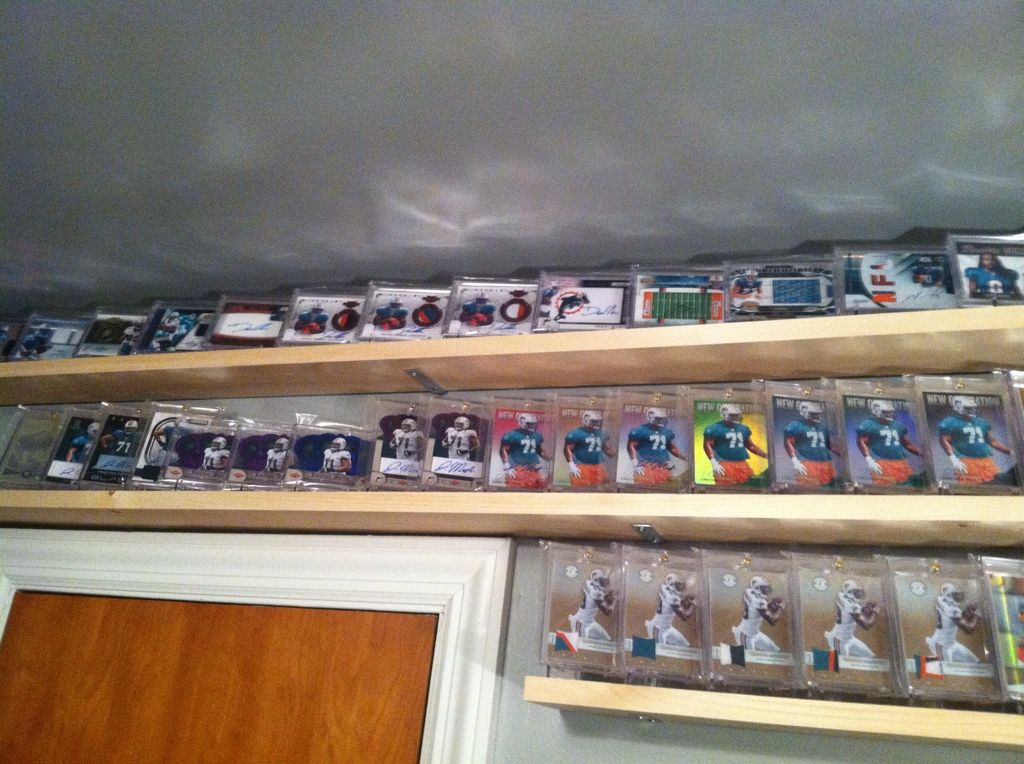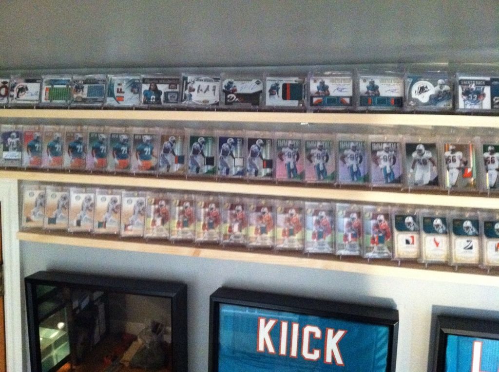 Started simple! ![]() ![]() put up a few shelves..... ![]() ![]() Some jersey frames... actually have a bunch of jersey's I need to put in the empty ones.. and get some new frames for other walls.... ![]() Add a bunch of cards..... ![]() ![]() ![]() Add a messy desk and a ton of stacks of cards that you have no idea how to categorize... ![]() ![]() thats how I display em! |