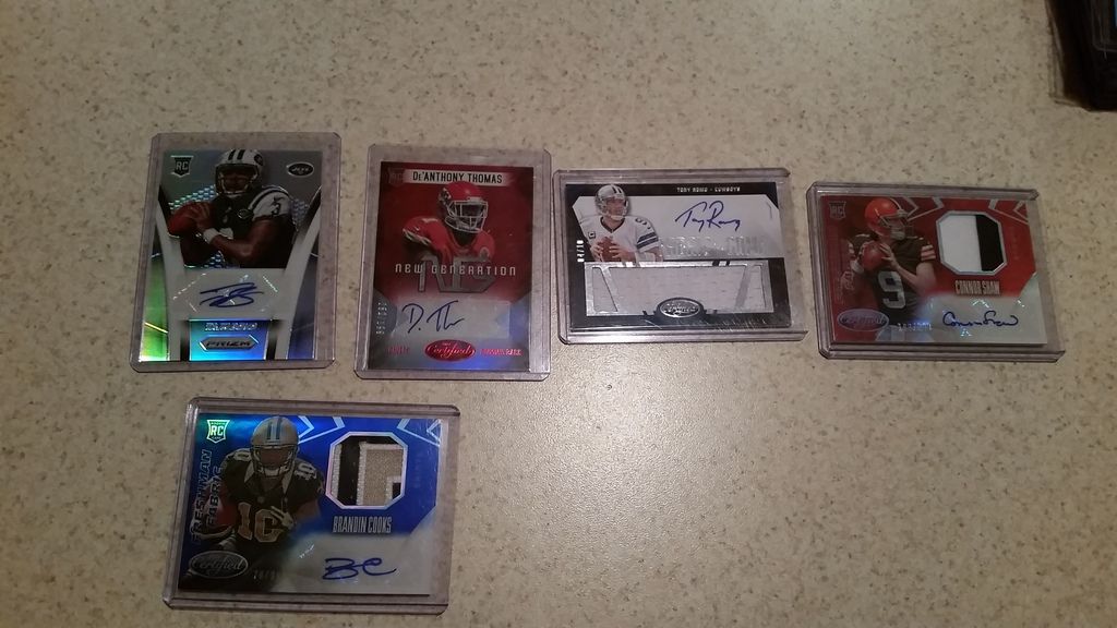 Thanks Charles Sims #42/50 4 color Connor shaw #169/249 2 color Brandin Cooks #78/99 3 color Tom Savage #91/99 3 color Tom Savage #122/699 2 color Tom Savage #1/25