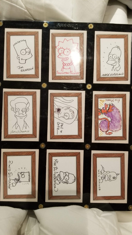 Let's try this again. I'll hopefully kickstart a new flurry with this image of my full set of all 9 artists from the "Simpsons Mania" set from Inkworks, made in 2001, so an early sketch set to be sure. Most of these artists were directors of the Simpsons TV series who, among them, literally have more than half of the classic episodes from the so-called "Golden Age" of the show, basically the 1990s, to their credits. ![]() (Thank to super sketch collector Prenz for this arrangement of the cards. Only Rich Moore used color on his cards so his and the cards from Phil Ortiz tend to command higher value. In Phil's case, it's because he drew many, many 1 of a kind characters who only appeared within his own set of sketch card (Each artist drew around 250, and most of them largely stuck to the core family members). My Ortiz is of Karl (voiced by Harvey Fierstein), Homer's executive assistant from the early episode where he grew hair and quickly ascended the corporate ladder as a result. Of special note to me is the card from David Silverman, the Simpsons director in my opinion who did the classic title sequence AND directed the Simpsons Movie from 10 years ago and the one from Wesley Archer. Wes is the animation genius who played a huge role in the development of Mike Judge's "King of the Hill", the second greatest animated series of all-time (after the Simpsons, which even Rick and Morty can never top). In addition to having one card from all 9 artists, I also made the effort to get at least one card of the main 5 Simpsons family members between them. There was also a set of autograph cards of the voice actors in this set, which I'll add soon.