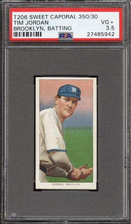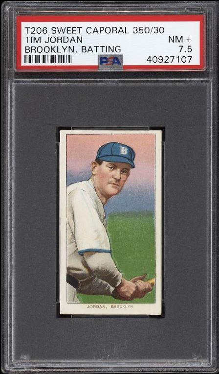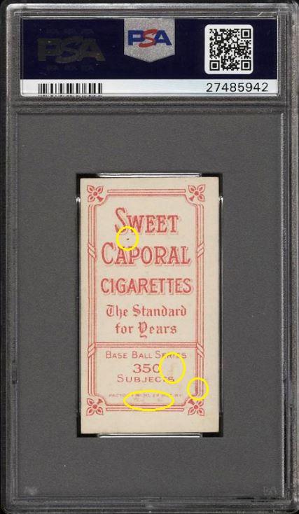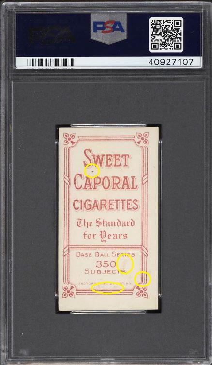 1909-11 T206 Tim Jordan BROOKLYN, BATTING Value gain of $740.00 This card was purchased by whitman111 (Gary Moser) from PWCC as a PSA-3.5 on September 10, 2017 for $71.00. PWCC Marketplace link: https://www.pwccmarketplace.com/items/1539622 Same card was sold by PWCC as a PSA-7.5 for $811.00 on July 08, 2018. PWCC Marketplace link: https://www.pwccmarketplace.com/items/1686689 Yellow circles are print and scuff mark identifiers. I can't see anything that has been done to allow this card an enormous grade bump. There is no mention of flaws in the original listing so there is no way to know. Nevertheless it's a Moser card and we know he likes to touch them inappropriately. ![]() ![]() ![]()