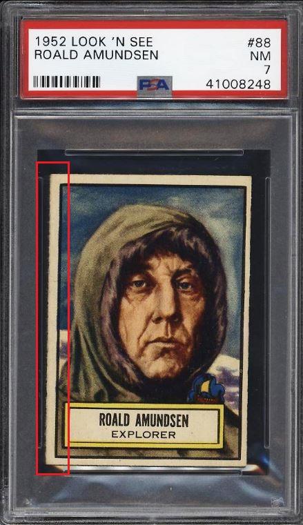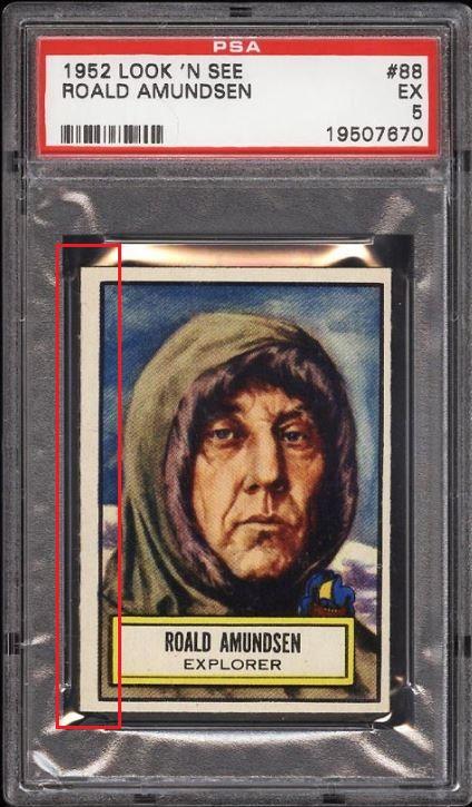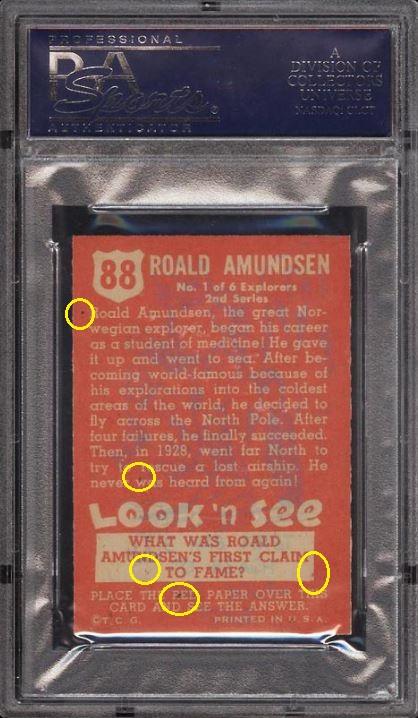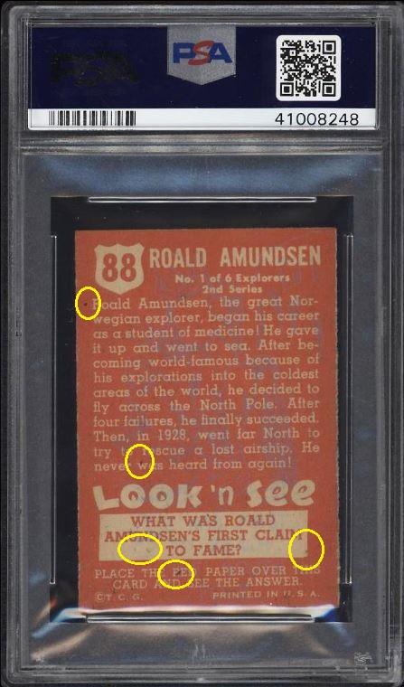 1952 Topps Look 'N See Roald Amundsen #88 Value gain of $189.40 This card was purchased by whitman111 (Gary Moser) from PWCC as a PSA-5 on September 27, 2017 for $13.09. PWCC Marketplace link: https://www.pwccmarketplace.com/items/1553799 Same card was sold by PWCC as a PSA-7 for $202.49 on October 29, 2018. PWCC Marketplace link: https://www.pwccmarketplace.com/items/1821467 Yellow circles are print and scuff mark identifiers. Red squares identify a trimmed and rough cut left edge. ![]() ![]() ![]()