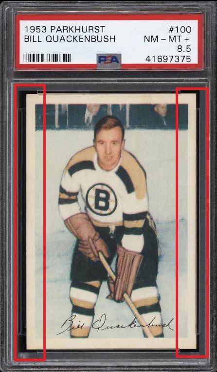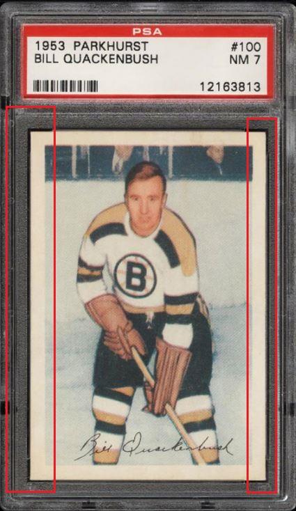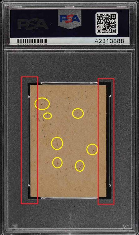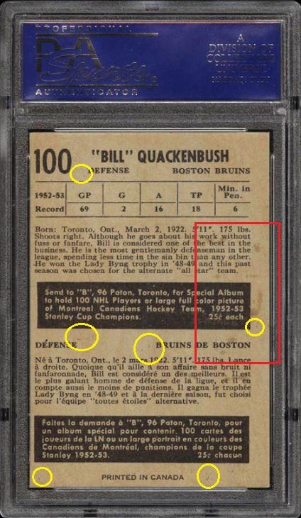 1953 Parkhurst Bill Quackenbush #100 Value gain of $707.50 This card was purchased by whitman111 (Gary Moser) from PWCC as a PSA-7 on February 20, 2018 for $190.50. PWCC Marketplace link: https://www.pwccmarketplace.com/items/1612375 Same card was sold by PWCC as a PSA-8.5 for $898.00 on November 19, 2018. PWCC Marketplace link: https://www.pwccmarketplace.com/items/1859824 Yellow circles are print and fiber identifiers. Red squares identify obvious edge trimming and stain reduction on the back. ![]() ![]() ![]() ![]()