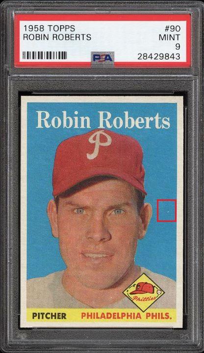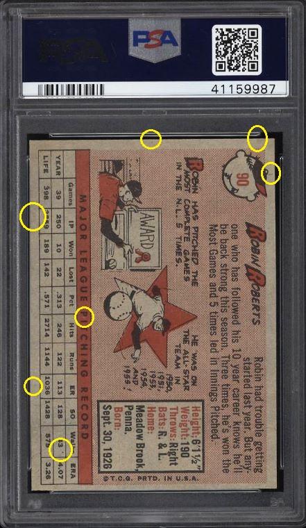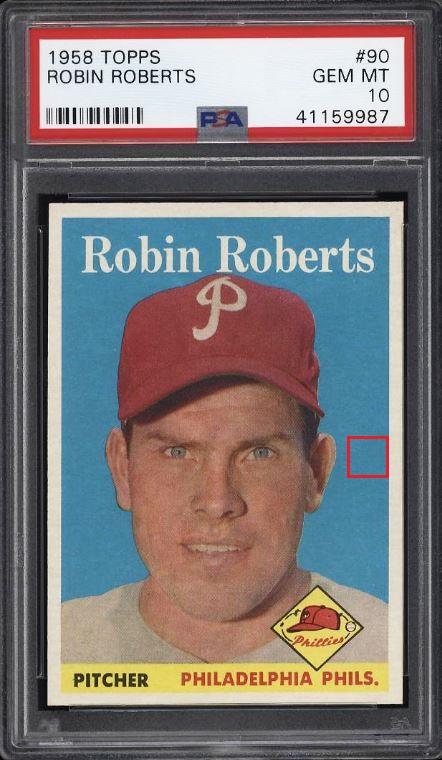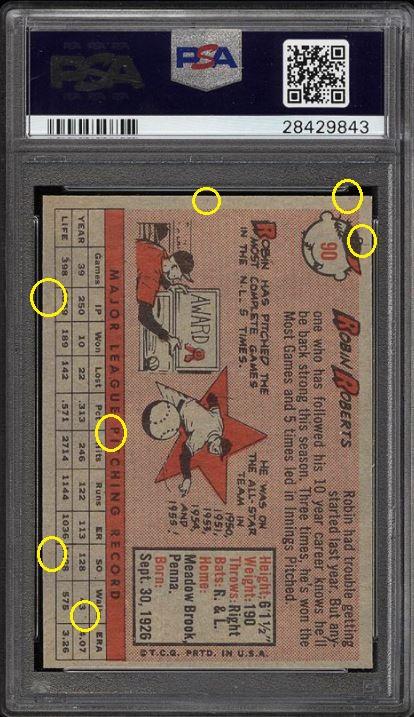 1958 Topps Robin Roberts #90 Value gain of $5,602.00 This card was purchased by whitman111 (Gary Moser) from PWCC as a PSA-9 on February 08, 2018 for $1,088.00. PWCC Marketplace link: https://www.pwccmarketplace.com/items/1602502 Same card was sold by PWCC as a PSA-10 for $6,690.00 on December 05, 2018. PWCC Marketplace link: https://www.pwccmarketplace.com/items/1882821 Yellow circles are print and fiber identifiers. Red squares identify possible color addition. I can't verify it and it is also possible that it is scanning glare. Otherwise I cannot determine from the images what was done that caused a grade bump to the only PSA-10 in existence. Either Moser fixed something or PSA is incompetent/inconsistent in analyzing the condition of cards. Or likely both. ![]() ![]() ![]() ![]()