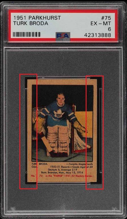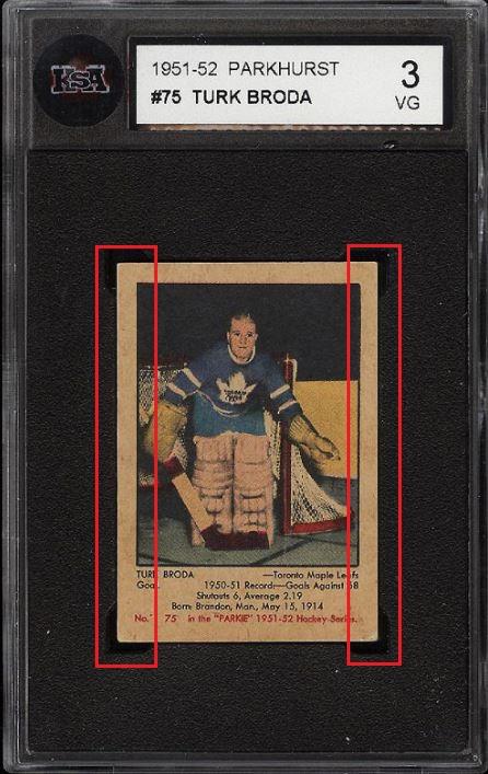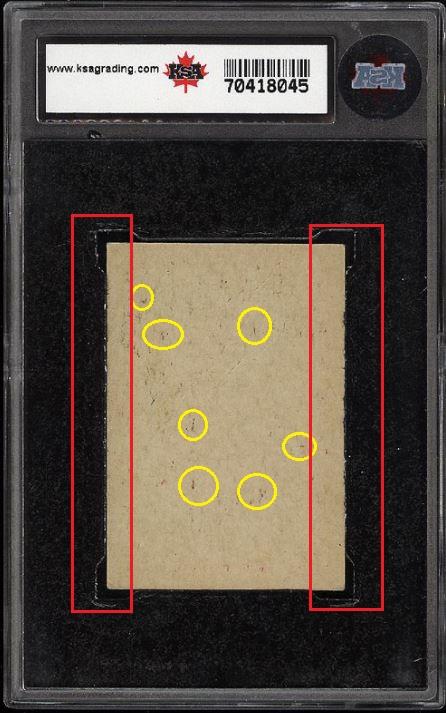 1951 Parkhurst Turk Broda #75 Value gain of $799.00 This card was purchased by whitman111 (Gary Moser) from PWCC as a KSA-3 on February 20, 2018 for $76.00. PWCC Marketplace link: https://www.pwccmarketplace.com/items/1612209 Same card was sold by PWCC as a PSA-6 for $875.00 on March 31, 2019. PWCC Marketplace link: https://www.pwccmarketplace.com/items/1934510 Yellow circles are print and fiber identifiers. Red squares identify obvious edge trimming. ![]() ![]() ![]() ![]()