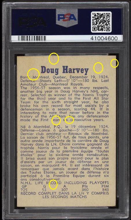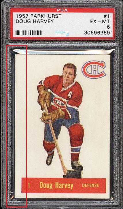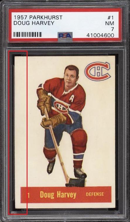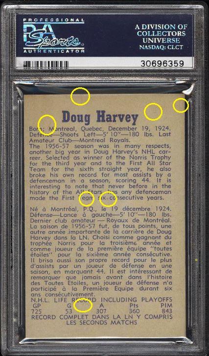 1957 Parkhurst Doug Harvey #M1 Value gain of $2,196.02 This card was purchased by whitman111 (Gary Moser) from PWCC as a PSA-6 on February 20, 2018 for $360.00. PWCC Marketplace link: https://www.pwccmarketplace.com/items/1612534 Same card was sold by PWCC as a PSA-7 for $2556.02 on October 28, 2018. PWCC Marketplace link: https://www.pwccmarketplace.com/items/1819009 From the PWCC PSA-7 listing description: "Incredibly tough #1 card to locate in PSA 7. This card is simply never seen on the public auction block, especially in such high-grade." "Very tough to improve upon." Yellow circles are print and fiber identifiers. Red squares identify edge trimming. ![]() ![]() ![]() ![]()