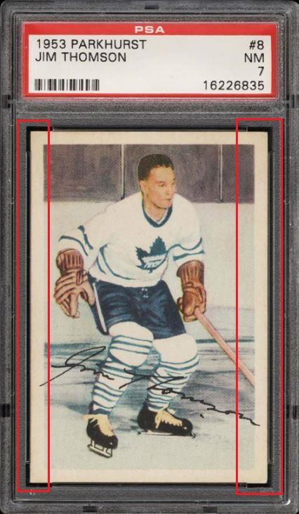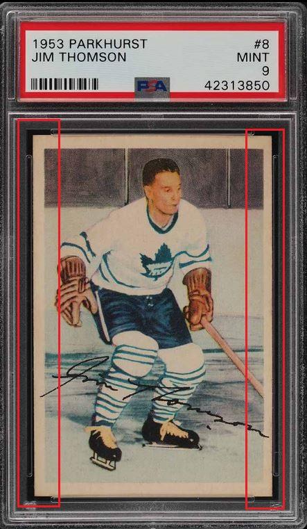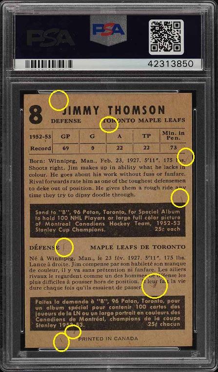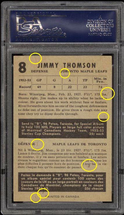 1953 Parkhurst Jim Thomson #8 Value gain of $611.55 This card was purchased by whitman111 (Gary Moser) from PWCC as a PSA-7 on February 20, 2018 for $54.00. PWCC Marketplace link: https://www.pwccmarketplace.com/items/1612289 Same card was sold by PWCC as a PSA-9 for $665.55 on March 25, 2019. PWCC Marketplace link: https://www.pwccmarketplace.com/items/1934576 From the PWCC PSA-9 listing description: "One of only three copies to reach the elite assessment and impossible to improve upon." Yellow circles are print and fiber identifiers. Red squares identify edge trimming. ![]() ![]() ![]() ![]()