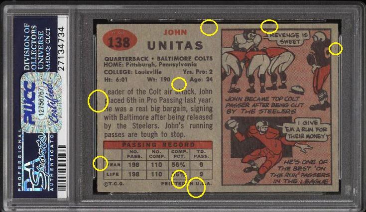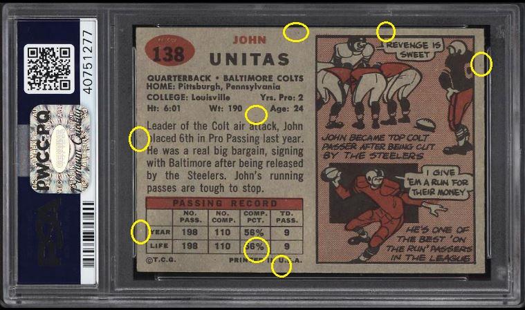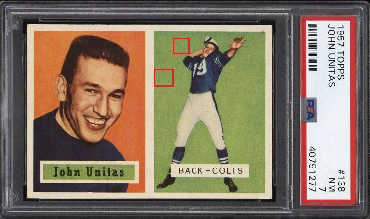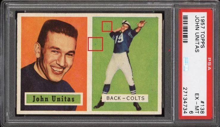 1957 Topps Johnny Unitas RC #138 Value gain of $938.01 This card was purchased by whitman111 (Gary Moser) from PWCC as a PSA-6 on December 18, 2017 for $836.99. PWCC Marketplace link: https://www.pwccmarketplace.com/items/1593810 Same card was sold by PWCC as a PSA-7 for $1,775.00 on June 21, 2018. PWCC Marketplace link: https://www.pwccmarketplace.com/items/1677150 From the PWCC PSA-7 listing description: "Rarely does this card surface with such amazing pack fresh tendencies." Yellow circles are print and fiber identifiers. Red squares identify color work on two printing spots. *These two blue marks are common print flaws on many Unitas rookie cards. ![]() ![]() ![]() ![]()
