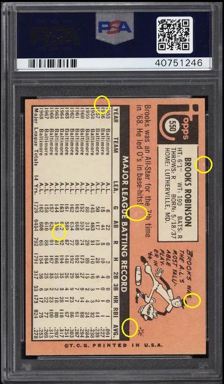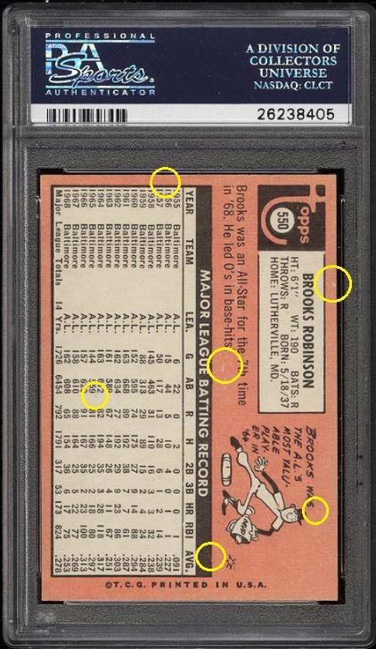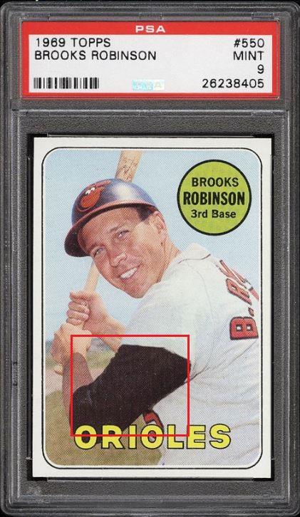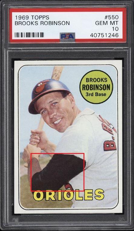 1969 Topps Brooks Robinson #550 Value gain of $2,447.29 This card was purchased by whitman111 (Gary Moser) from PWCC as a PSA-9 on November 15, 2017 for $158.27. PWCC Marketplace link: https://www.pwccmarketplace.com/items/1575270 Same card was sold by PWCC as a PSA-10 for $2,605.56 on June 14, 2018. PWCC Marketplace link: https://www.pwccmarketplace.com/items/1672434 Yellow circles are print and fiber identifiers. Red squares identify the darkened sleeve. Moser has added color to dark areas before so this could be the area that was improved to bring the card to a 10. The alternative is that PSA is inconsistent in their ability to accurately grade cards. Posted because one of these occurred. ![]() ![]() ![]() ![]()
