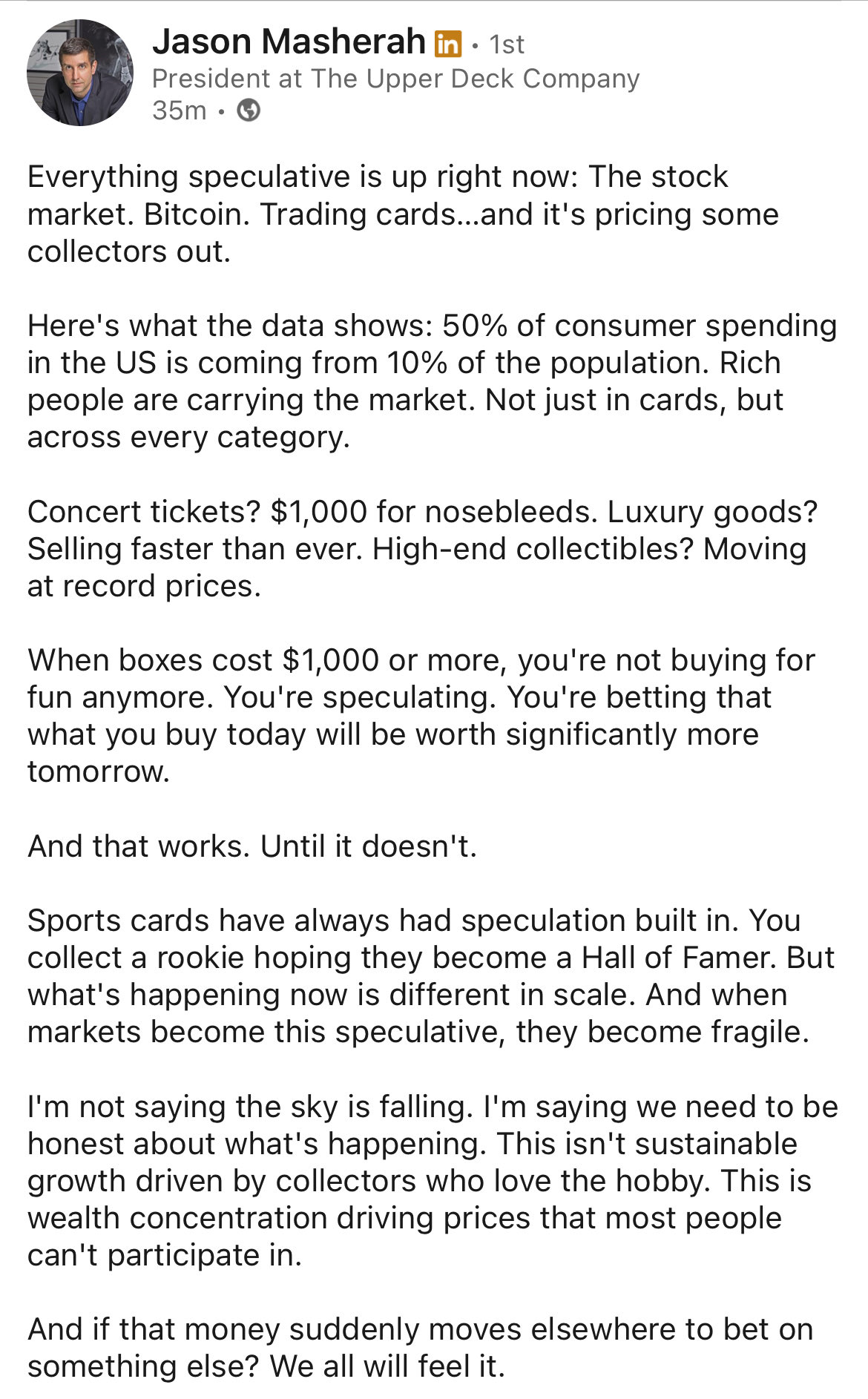 We are in a two-tiered economy, with the gap widening over time -- how will this effect the trading cards market going forward? |