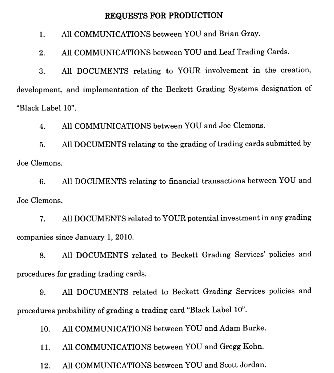 Assuming Beckett isn't a party to the lawsuit it's a third party subpoena which can be served any time. Doesn't rule out that it's an older case. I am trying to figure out why the relationship between Beckett and Leaf would be relevant to claims by Upper Deck, but haven't yet. And I still don't know why this thread has doctored cards in the title, nothing in the Joe Clemons thread suggested he was doctoring cards, or that the Black Labels were being given to doctored cards, did it?