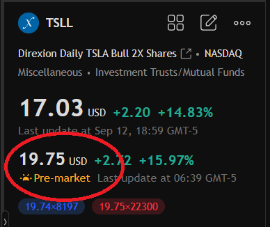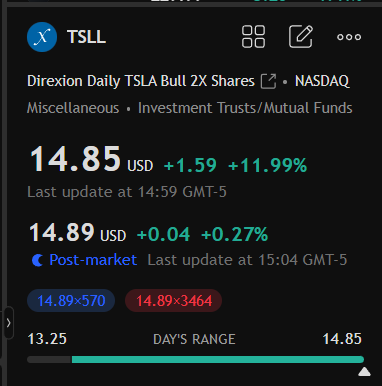 But as you mentioned I'm counting on a run up as technical indicators suggest an upward trend > 405 > 420 (could get derailed with bad news) TSLA has large swings (up/down) TSLA up $31 today > TSLL faster recovery from down days From my entry point back in April, I'm already back to where I was as far as gains after the big June drop Picked up the shares at $7 > they peaked at $16.35 > currently @ $15.15 AH I already hold a sizeable position in TSLA stock so made sense to add TSLL on the April dip @ $7 vs. $210ish TSLA Side note* TSLL is the only leveraged ETF I'd ever own. Other leveraged move too slow and that leads to decay, those are the ones you'd want to be in and out on pops