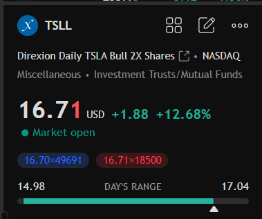 Full recovery on TSLL. This is why I like TSLL on TSLA dips - 405 > 420 next
