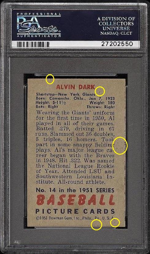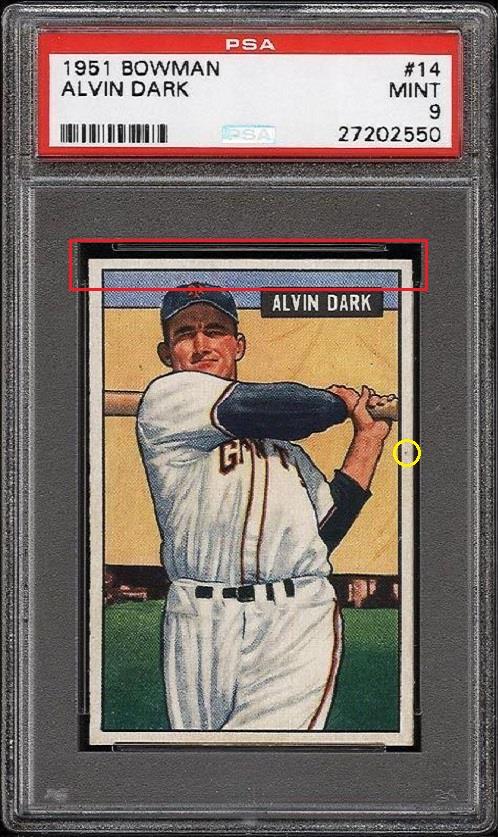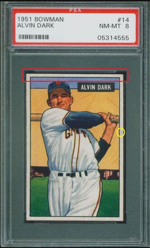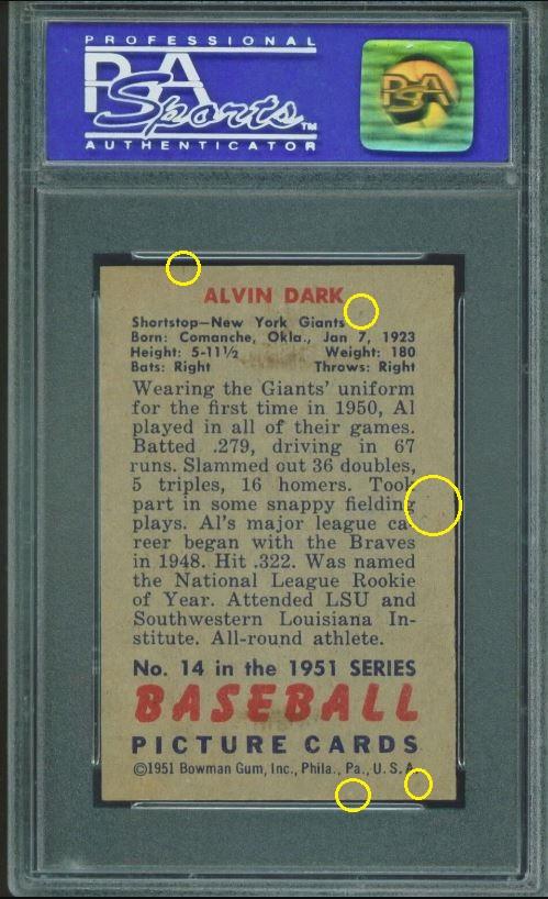 PSA Set Registry: none 1951 Bowman Alvin Dark #14 Value gain of $634.13 This card was purchased by masked VCP ID m***h (Johnny Adams, Jr.) from Ebay seller www,stevenovella,com as a PSA 8 for $76.88 on July 14, 2016. VCP link: https://vintagecardprices.com/card/b...=&limit=999999 Same card was sold by PWCC as a PSA 9 for $711.01 on July 09, 2017. VCP link: https://vintagecardprices.com/card/b...14/69962/PSA/9 Yellow circles are print, fiber, or chipping identifiers. Red box identifies trimmed top edge. Staining has been minimized on the back. ![]() ![]() ![]() ![]() ![]()