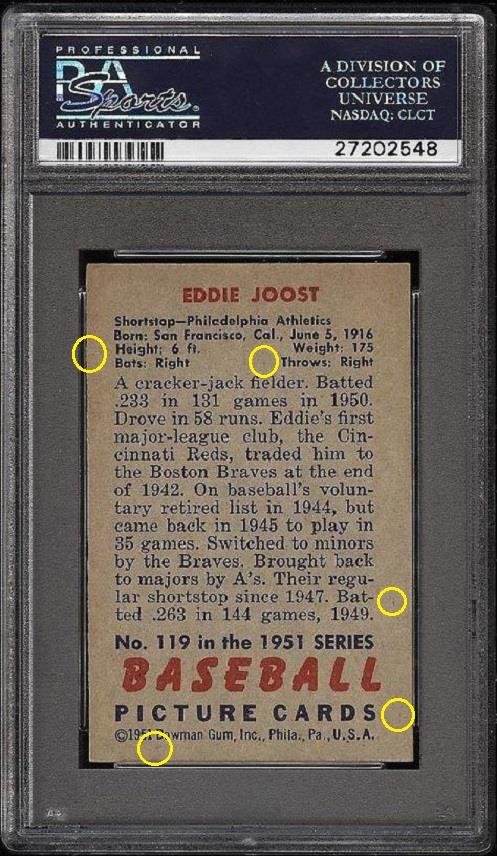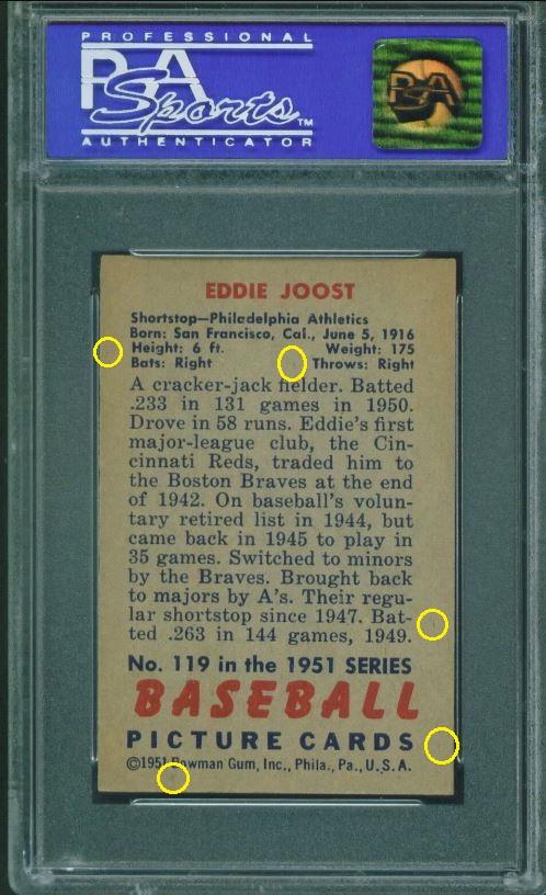 PSA Set Registry: none 1951 Bowman Eddie Joost #119 Value gain of $681.07 This card was purchased by masked VCP ID m***h (Johnny Adams, Jr.) from Ebay seller www,stevenovella,com as a PSA 8 for $50.05 on July 14, 2016. VCP link: https://vintagecardprices.com/card/b...19/69856/PSA/8 Same card was sold by PWCC as a PSA 9 for $731.12 on July 09, 2017. VCP link: https://vintagecardprices.com/card/b...19/69856/PSA/9 Yellow circles are print, fiber, or chipping identifiers. Red box identifies what appears to be a partially trimmed right edge - to even out the border. As usual, the PWCC scans are not real sharp. ![]() ![]() ![]() ![]() ![]() ![]()