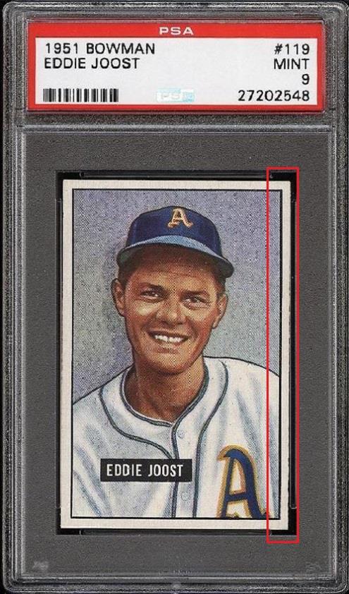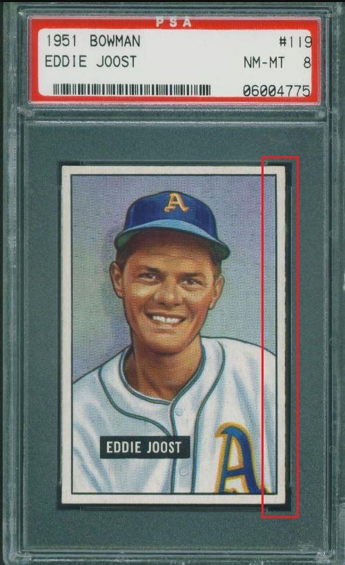 This Eddie Joost card is a perfect example of why I no longer trust anything in a graded slab. I have to be honest and say if I looked at this trimmed card in person, I doubt it would appear altered to me. It's only when it's placed side-by-side next to its PSA8 ancestor that the trimming becomes evident. It's escapes me how people can continue to pay huge sums for high-grade slabs. These card doctors, and there are a good number of them, are like buzzards, circling shows, eBay and the major auction houses 24/7/365 with talons bared. No cards is safe. Never get cheated. Quote: