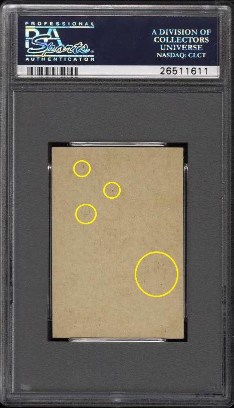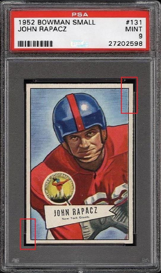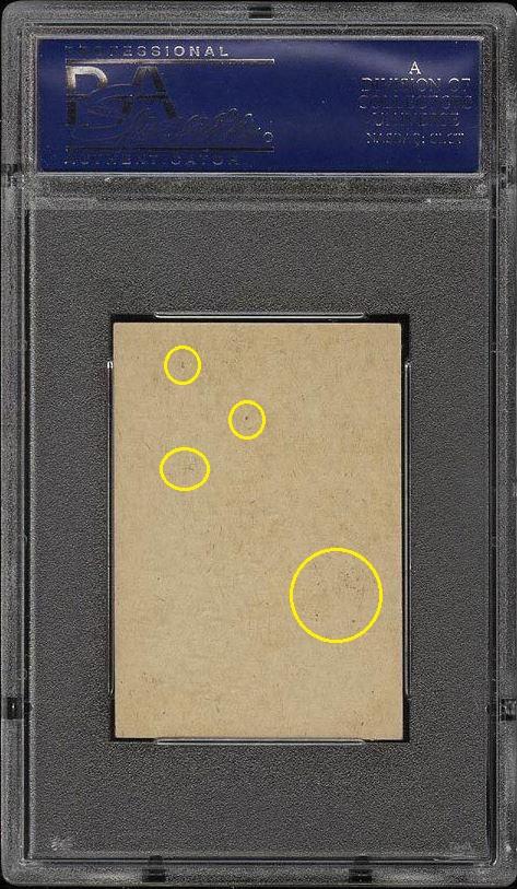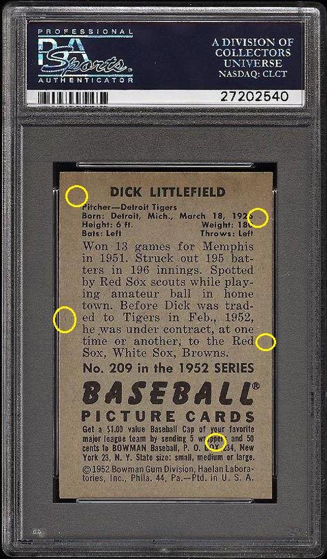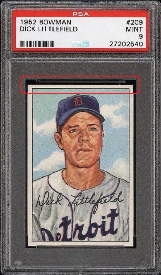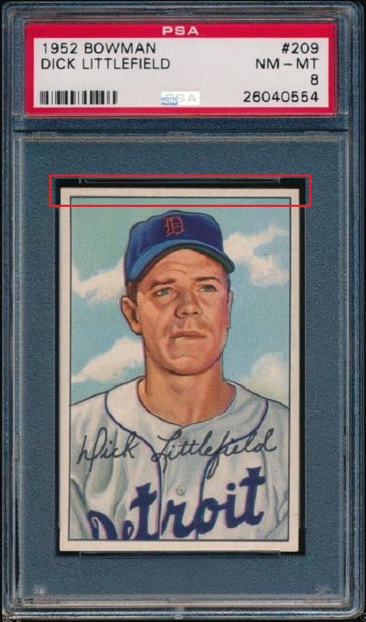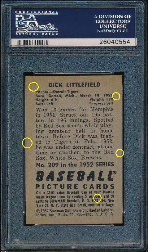 PSA Set Registry: CUGoldenBuffalo 1952 Bowman Dick Littlefield #209 - population 1 of 8 Value gain of $232.52 This card was purchased by masked VCP ID m***h (Johnny Adams, Jr.) from Ebay seller tsc*c as a PSA 8 for $38.00 on September 28, 2016. VCP link: https://vintagecardprices.com/card/b...09/69241/PSA/8 Same card was sold by PWCC as a PSA 9 for $270.52 on July 09, 2017. VCP link: https://vintagecardprices.com/card/b...09/69241/PSA/9 Yellow circles are print, fiber, or chipping identifiers. Red box identifies trimmed top edge. ![]() ![]() ![]()