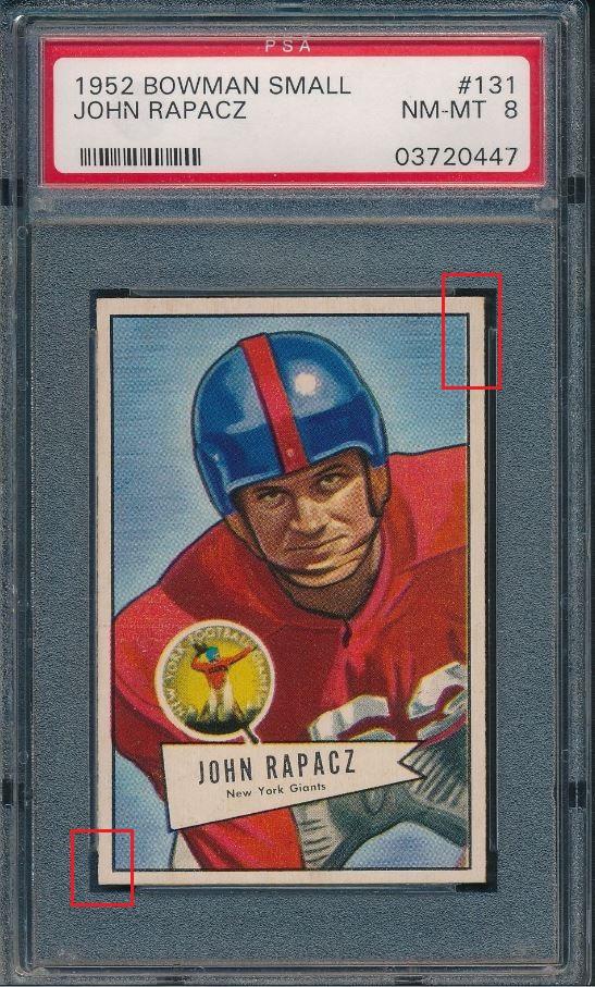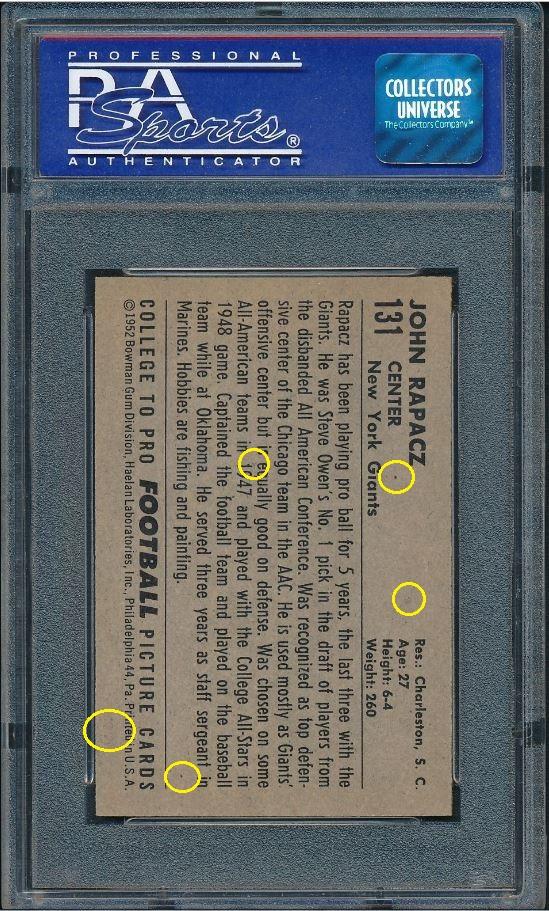 PSA Set Registry: none found 1952 Bowman Small John Rapacz #131 - population 1 of 2 - none graded higher Value gain of $1,216.01 This card was purchased by masked VCP ID m***h (Johnny Adams, Jr.) from Ebay seller www,stevenovella,com as a PSA 8 for $86.99 on January 10, 2017. VCP link: https://vintagecardprices.com/card/f...1/100665/PSA/8 Same card was sold by PWCC as a PSA 9 for $1,303.00 on July 17, 2017. VCP link: https://vintagecardprices.com/card/f...1/100665/PSA/9 Yellow circles are print, fiber, or chipping identifiers. Red boxes identify at least partially trimmed edges and corner work. In hand would have made it much easier to detect. ![]() ![]() ![]() ![]() ![]()