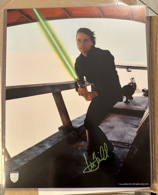 You can get some great autos - I usually choose to use one of the 8x10s that Official Pix provides, and I love that you can pick the ink color. I don't add character names or personalization, so I recently got three great 8x10s - Gina Carano as Cara Dune picture from the Mando in purple paint pen, Ewan MacGregor picture from Obi-Wan Series in blue paint pen, and Hayden C. picture from AOTS where he hasn't quite turned yet but is getting close in red paint pen. In total with return shipping, it was around $600 for all three. Only thing is, while some top names (let's excuse Hamill from the conversation, as we discussed above his price is $500 or so) like MacGregor and Christensen were about $150 per auto, there are some fringe characters that they charge $100 for as well. There was an 8x10 from Ahsoka with Ahsoka, Ezra and Sabine all with lightsabers drawn getting ready to fight. They wanted $150ish for Dawson which makes sense, but the actors who played Ezra and Sabine they wanted about $100 apiece for their autos, which I couldn't justify. Would have been neat though to have that 8x10 signed in paint pen by their lightsaber color, respectively (white, blue & green) - but the piece wasn't worth close to $600 for me, so I just purchased a Dawson in orange paint pen to match her skin tone. Anyway, enough rambling, point being, with some of the actors, the price point between the "stars" and non-"stars" is usually not that different, which leads me to passing on autographs I think would look neat on my walls (though I'm running out of room in the man cave as it is)!