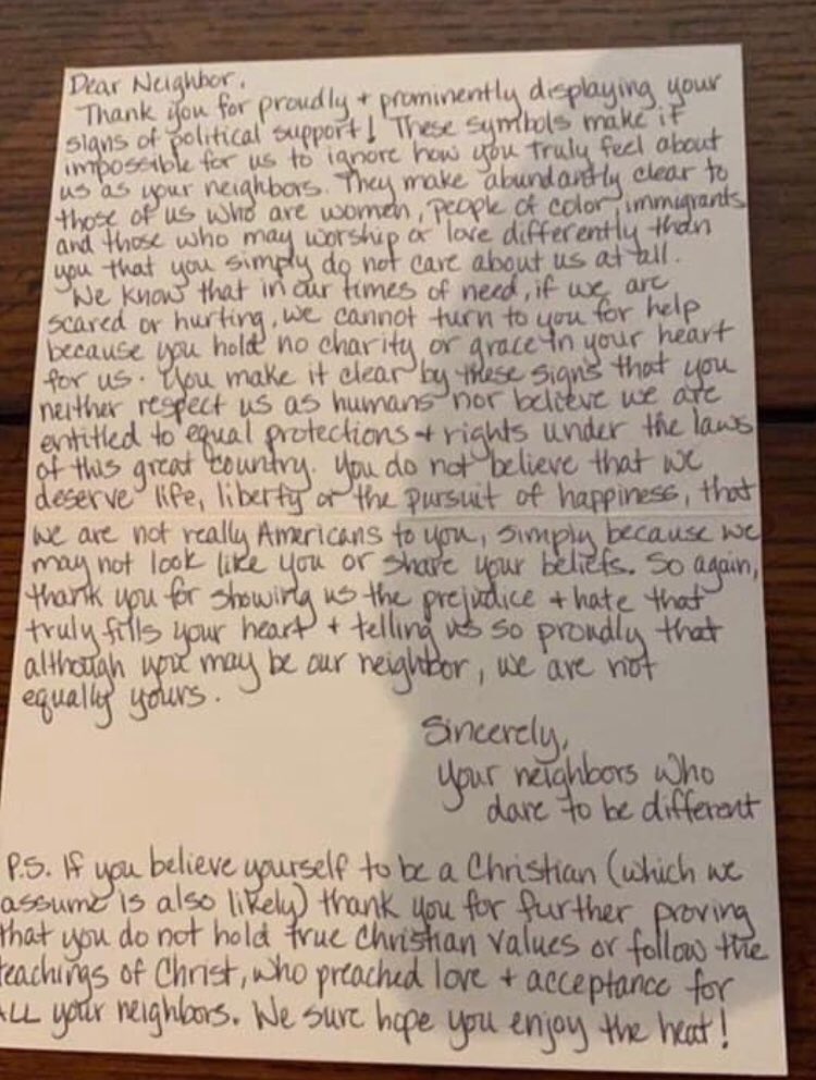 Someone wrote a very nice letter to a neighbor who had a Trump sign in their yard.