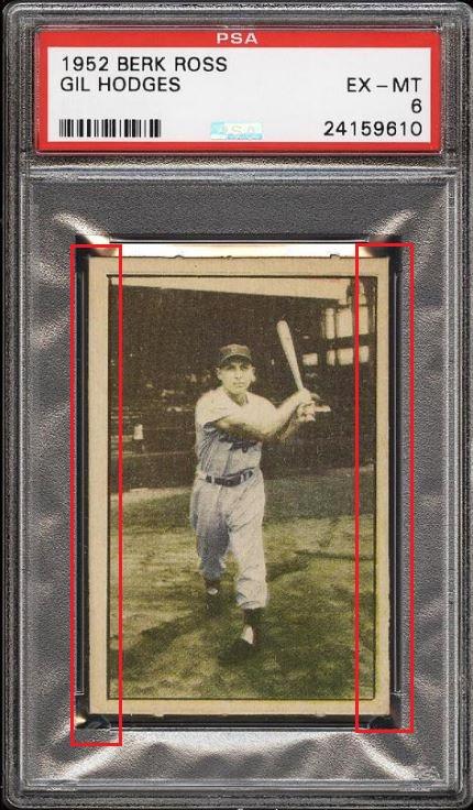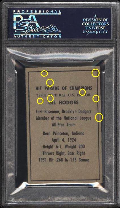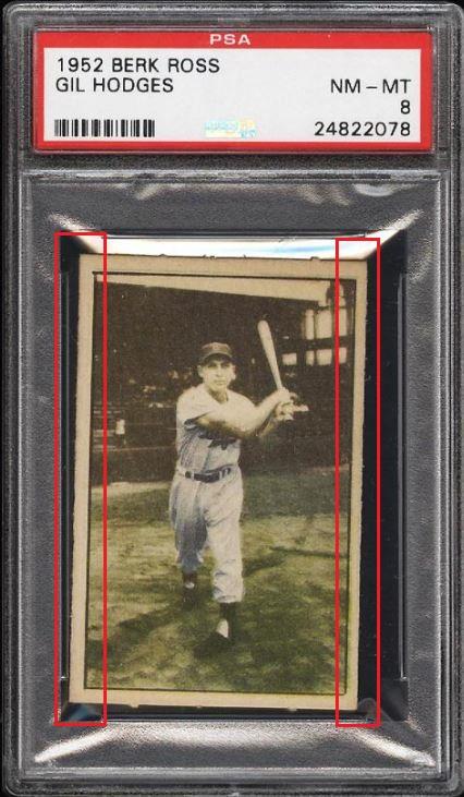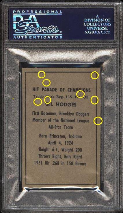1952 Berk Ross Gil Hodges Value gain of $52.37 This card was purchased by whitman111 (Gary Moser) from PWCC (Brent and Betsy Huigens) as a PSA-6 on July 09, 2015 for $71.13. PWCC Marketplace link: https://www.pwccmarketplace.com/items/1148063 Same card was sold by PWCC (Brent and Betsy Huigens) as a PSA-8 for $123.50 on June 08, 2017. PWCC Marketplace link: https://www.pwccmarketplace.com/items/1486016 Yellow circles are print or fiber identifiers. Red squares identify trimmed left and right edges with artificial rough cut. ![]() ![]() ![]()