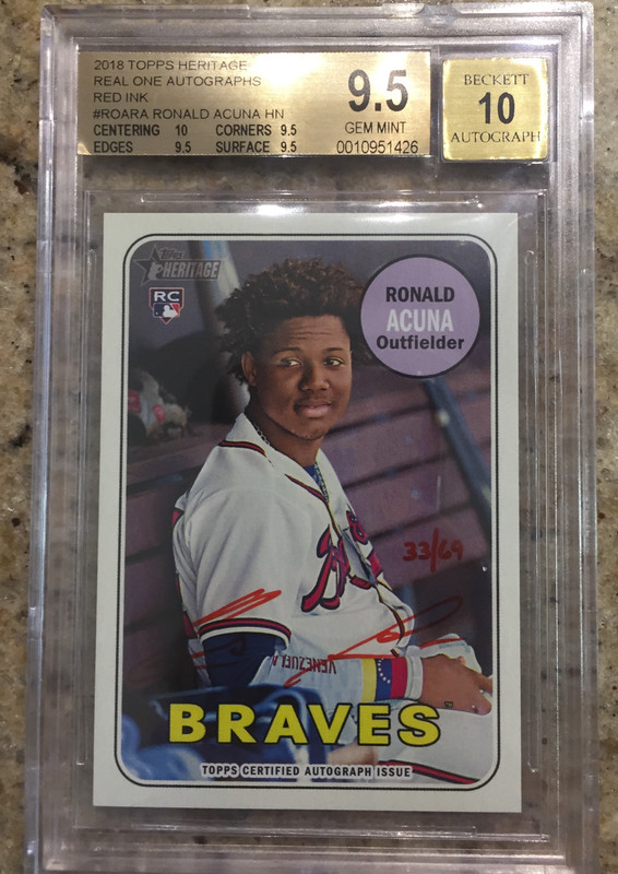 Be careful out there friends! Acuna Topps Heritage Red Auto #17/69 is back on sale again! It was sold by ebay user agentorange1982 (4598 ) as an auction on Dec 10th for $2916 and is listed again for sale today by a different ebay user uncc49er2012 (1559) who was not the winning bidder last time. I contacted uncc49er2012 (1559 ) on this and his response was user agentorange1982 and him jointly own the card and the winning bidder of the last week auction did not pay for the item. If you look at the last week auction bid history, uncc49er2012 (1559) also bid on it until $2501.