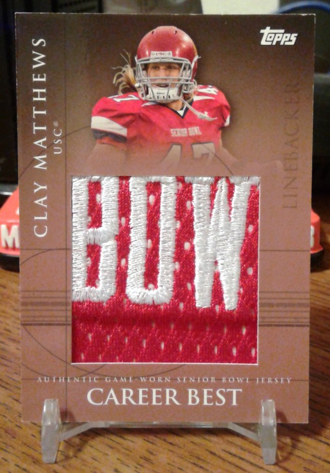 Picked up this 2009 Topps Career Best RC JUMBO of Clay Matthews earlier this year #'d /20. I did not know the jumbo variation existed. These are his only RC Relics because Clay was not at the Rookie Premiere so they used his Senior Bowl uniform. The Base is not #'d and the Silver is #'d /99