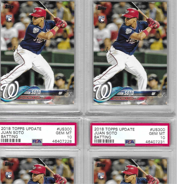 Full, or nearly full "W" is usually the standard on the front (left/right), and a small gap on the bottom between the blue swoop and the bottom edge (top/bottom). The back is easier to gauge with the font (left/right) and the box for stats (top/bottom). |