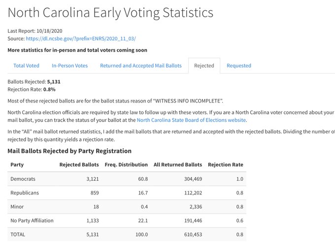 In North Carolina; you need to complete witness info. So far in NC, Dem ballots getting rejected at a higher rate (and a lot more of them).