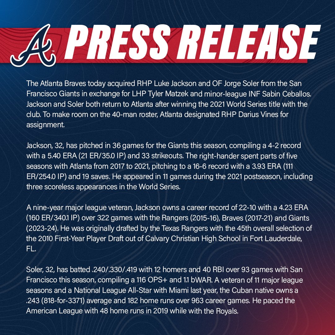 The Braves were never going to be in the market for the top players available. For a couple reasons. One being that part of the reason they are middle of the pack is that most of their core (guys that aren't getting traded) aren't performing. This isn't a team that needs a big time position player to make them a WS contender, they need an upgrade over Wall/Williams/Duvall/Rosario, and Soler is just that. As Wolf said, they need their studs to hit. Could they use another starting pitcher, sure, probably. But they have enough pitching right now to field a competitive playoff rotation. Fried will be back to go along with Sale and Lopez. If the studs in the lineup start hitting, Schwellenbach/Morton is going to be just fine as a 4th starter in the playoffs. But the biggest issue as to why they haven't gone after bigger names (and we still have a few hours for a potential move) is they simply don't have the farm system depth to do it. It's a bottom 5-6 farm system. What do you think it's going to take to get a Crochet or Skubal? At the end of the day, if the offense doesn't start rolling, one stud pitcher isn't going to change a thing. And the way this season has gone, there's no reason for the Braves to be big time buyers this year. It's not like the window is closing after this season. |