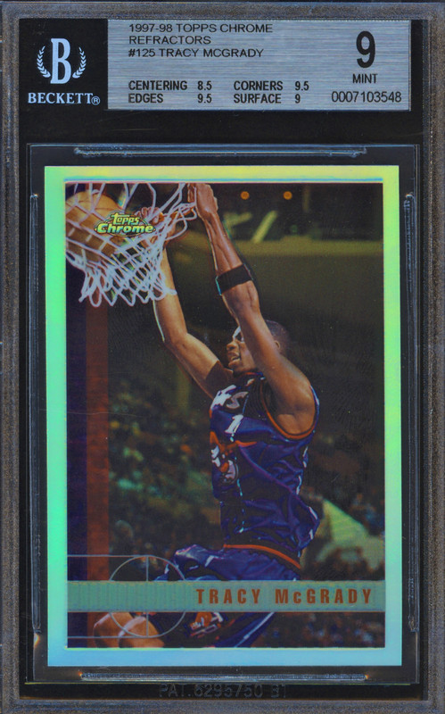 I miss my McGrady TC refractor rookie. Sold it too early. That centering grade is rough. It looks better than an 8.5. Centering on those TC refractors should be measured from the silver border to the picture, not to the indented frame around it on the top layer of acetate. It looks like they did that here on the McGrady's top border.