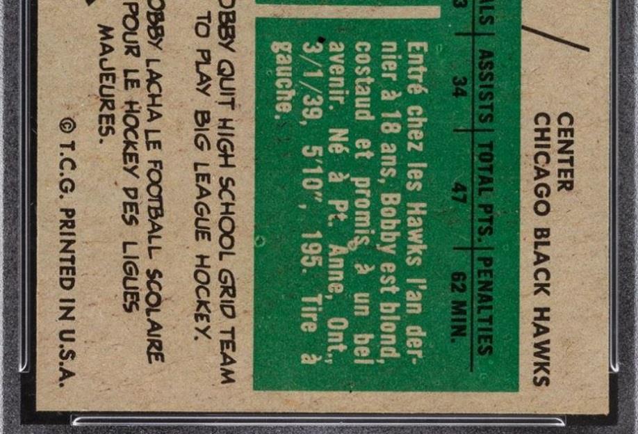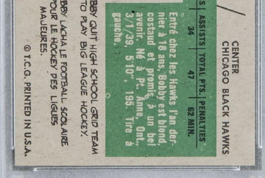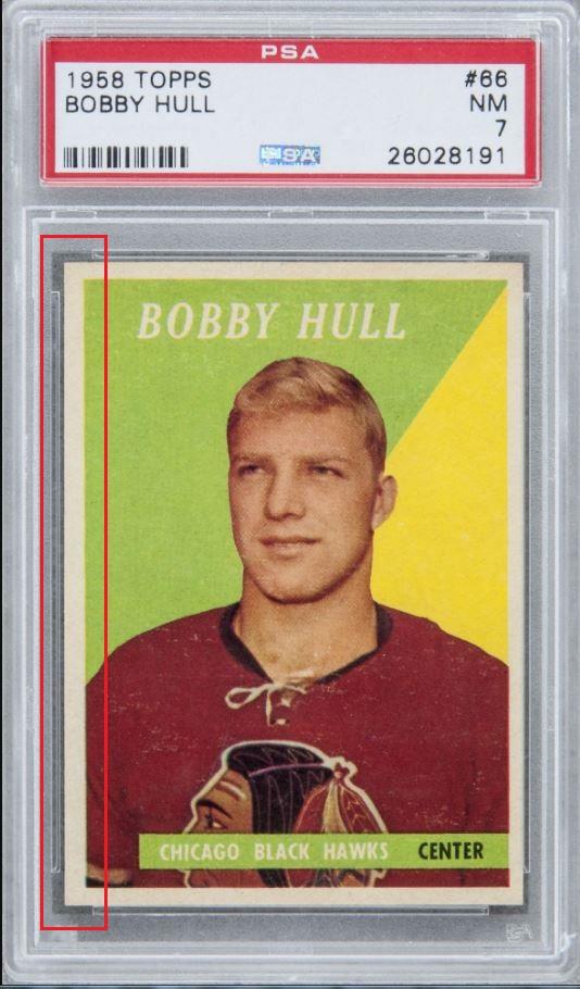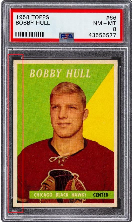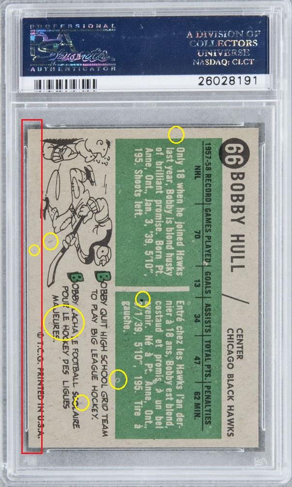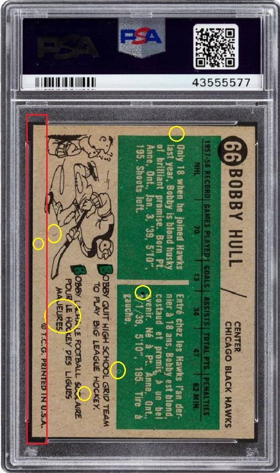 PSA Cert #43555577 1958 Topps Bobby Hull #66 Value gain of $60,000.00 This card was purchased by an unknown buyer from Goldin Auctions as a PSA 7 for $18,000.00 on either October 02, 2016 (according to VCP) or November 05, 2016 (according to PSA). VCP link: https://vintagecardprices.com/card/h...66/74666/PSA/7 Same card was sold by Heritage Auctions as a PSA 8 for $78,000.00 on July 20, 2019. VCP link: https://vintagecardprices.com/card/h...66/74666/PSA/8 Yellow circles are print, fiber, or chipping identifiers. Red box identifies trimmed left edge. It is entirely possible that the image pickout (offset or white snow) that is so easily visible on the front of the PSA 7 had been colored over before being regraded. The scanning contrast is much darker in the PSA 8 image, but I don't think that it would diminish the offset enough to actually hide it. The back scans show the red ink transfer (offset) from the card that would have been directly below it when being printed. It is also possible, but not likely, that the white snow is coming from a very scuffed up surface of the holder. ![]() ![]() ![]() ![]() ![]() ![]() ![]()