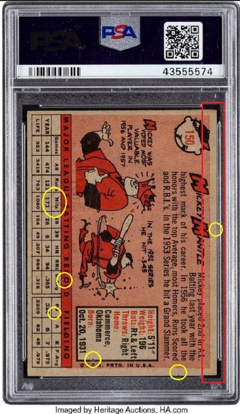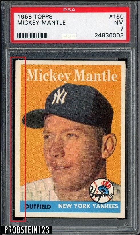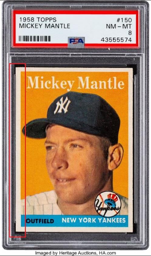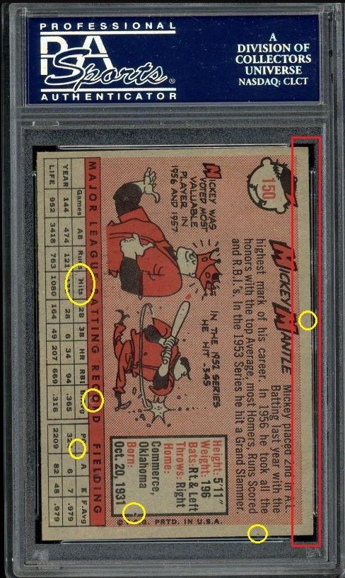 ***This card was graded just three cards prior (cert #s) to the Hull posted earlier and sold on the same day by Heritage Auctions. PSA Cert #43555574 1958 Topps Mickey Mantle #150 Value gain of $4,775.00 This card was purchased by VCP masked buyer ID r***t from probstein123 as a PSA 7 for $1,525.00 on July 09, 2018. VCP link: https://vintagecardprices.com/card/b...=&limit=999999 Same card was sold by Heritage Auctions as a PSA 8 for $6,300.00 on July 20, 2019. VCP link: https://vintagecardprices.com/card/b...50/65812/PSA/8 Yellow circles are print, fiber, or chipping identifiers. Red box identifies trimmed left edge. ![]() ![]() ![]()