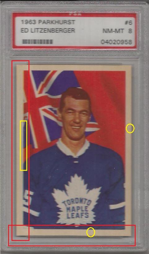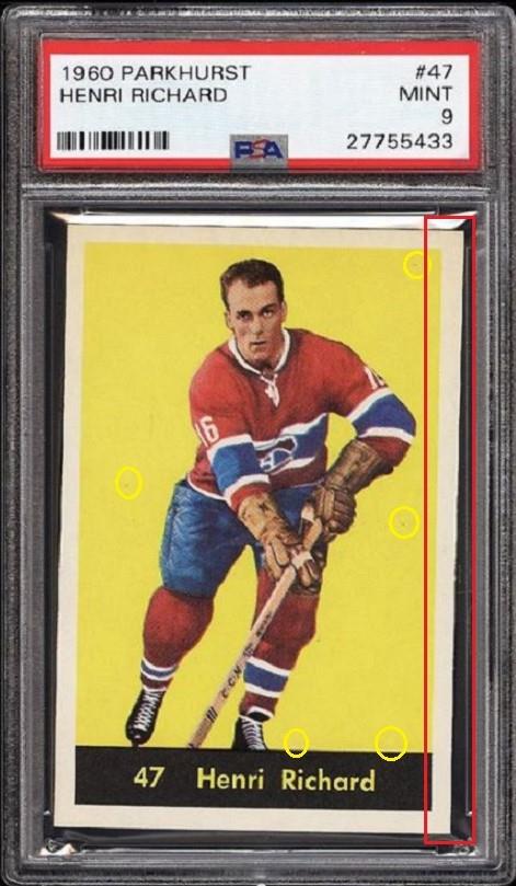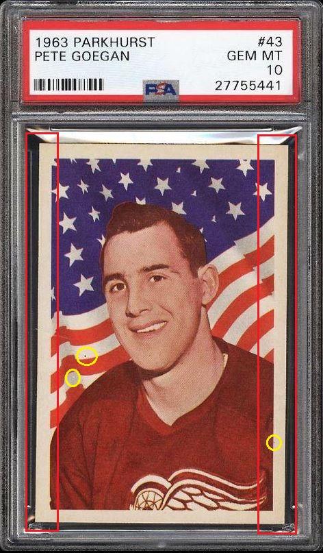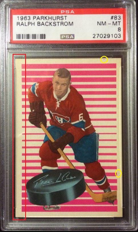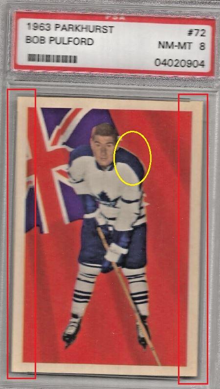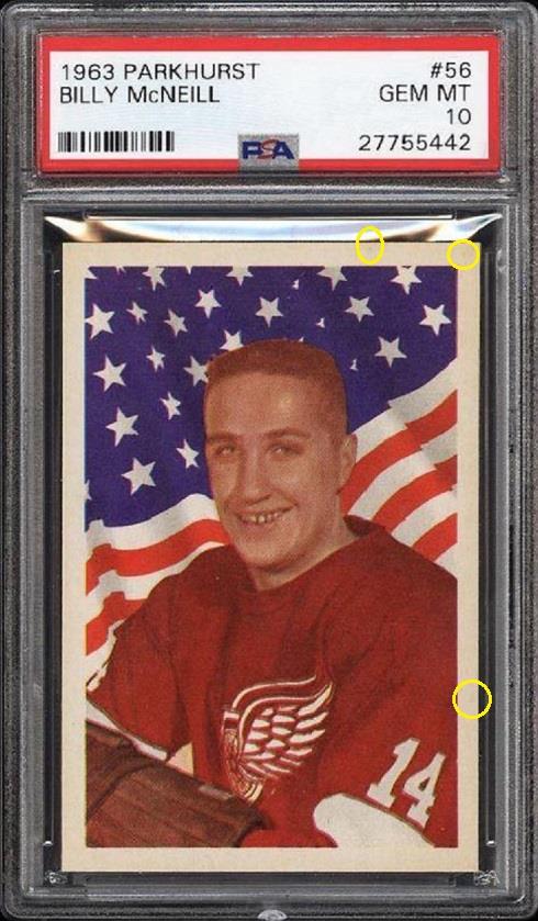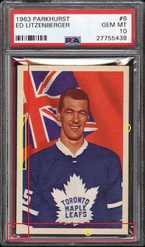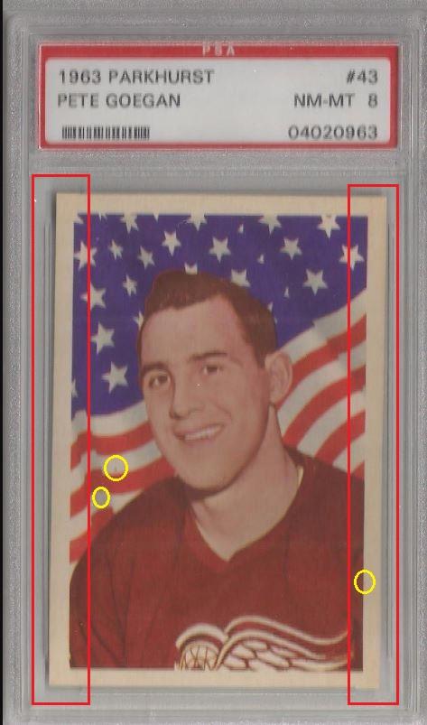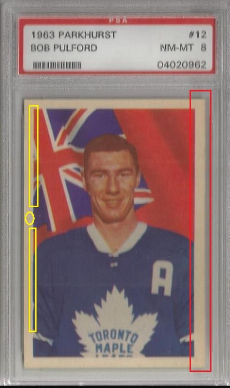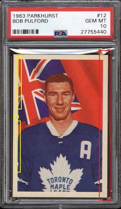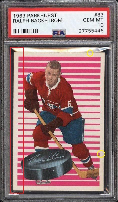 It took me a while to figure this one out (I think). I came across this string of vintage graded PSA 10s several weeks ago and couldn't pin down who submitted them. I have typically seen the usual masked VCP ID of b***y when I find the before purchases, but it wasn't the case this time. The submission numbers in the cards that I am about to post begin with 27755431 and end with 27751452 and total 21 cards. There are three different initial VCP purchase IDs involved that include an unknown Ebay ID with the masked Ebay ID of 9***9 and VCP masked ID of e***c, and an unknown Ebay ID with a masked Ebay ID of p***e and a matched VCP masked ID of p***e and a VCP masked ID of t***9 . While I cannot confirm a link between the three, they do seem to be from the same submission and all of the after sales were through PWCC with many being sold on the same date. The majority of the posted card images have poor first sale scans or only a front scan that I could not 100% confirm a match. I posted the first scans that I am confident are a match. In a sequentially numbered stretch of 21 PSA certs, there are 13 vintage PSA 10s - most trimmed and the others with no prior sale found. In that 21 card range there were 10 consecutive 10s given by PSA's experts. I believe the odds of that occurring with 50+ year old trimmed cards is astronomical without insider assistance from within PSA. Any help in identifying these three masked VCP ID's would be greatly appreciated. The cards are as follows: #27755431 - PSA 10 - 1960 Parkhurst Jack McIntyre #24 Could not find a prior sale. Sold by PWCC on 11/27/17 for $2,024.00. #27755432 - PSA 9 - 1960 Parkhurst Barry Cullen #32 Could not find a prior sale. Sold by PWCC on 10/26/17 for $88.66. #27755433 - PSA 9 - 1960 Parkhurst Henri Richard #47 Purchased by e***c on 6/12/17 as a PSA 8 for $250.00. Sold by PWCC on 10/26/17 for $379.00. Only a front scan provided. Trimmed on right edge. PSA Set Registry: George's Gems ![]() ![]() #27755434 - PSA 9 - 1961 Topps Murray Balfour #33 No sale record in VCP. #27755435 - PSA 8 - 1961 Topps Doug Harvey #45 Could not find a prior sale. Sold by PWCC on 10/26/17 for $59.00. #27755436 - PSA 9 - 1962 Parkhurst Jean Beliveau #39 Purchased by e***c on 12/01/16 as a PSA 8 for $110.95. No sale record on VCP. #27755437 - PSA 10 - 1963 Parkhurst Dick Duff #4 Purchased by e***c on 03/27/17 as a PSA 8 for $36.00. Sold by PWCC on 11/27/17 for $561.00. Poor first scan. Borders and mis-registered colors match (not 100% though). Trimmed right edge. PSA Set Registry: George's Gems ![]() ![]() #27755438 - PSA 10 - 1963 Parkhurst Ed Litzenberger #6 Purchased by e***c on 03/27/17 as a PSA 8 for $30.00. Sold by PWCC on 11/27/17 for $235.50. Poor first scan. Borders, smudges, and mis-registered colors match (not 100% though). Trimmed left and bottom edges. PSA Set Registry: private ![]() ![]() #27755439 - PSA 10 - 1963 Parkhurst Bob Nevin #10 Purchased by e***c on 03/27/17 as a PSA 8 for $36.00. Sold by PWCC on 11/27/17 for $787.00. Poor first scan. Borders, smudge, and mis-registered colors match (not 100% though). Trimmed right edge. PSA Set Registry: George's Gems ![]() ![]() #27755440 - PSA 10 - 1963 Parkhurst Bob Pulford #12 Purchased by e***c on 05/23/17 as a PSA 8 for $30.00. Sold by PWCC on 11/27/17 for $257.00. Poor first scan. Borders, smudge, and mis-registered colors match (not 100% though). Trimmed right edge. PSA Set Registry: Martin the Erudicious Hockey Antiquarian ![]() ![]() #27755441 - PSA 10 - 1963 Parkhurst Pete Goegan #43 Purchased by e***c on 05/23/17 as a PSA 8 for $30.00. Sold by PWCC on 11/27/17 for $699.00. Poor first scan. Borders, smudge, print spots match (not 100% though). Trimmed left and right edges. PSA Set Registry: George's Gems ![]() ![]() #27755442 - PSA 10 - 1963 Parkhurst Billy McNeill #56 Purchased by e***c on 05/28/17 as a PSA 8 for $24.99. Sold by PWCC on 11/27/17 for $678.00. Poor first scan. Borders, smudge, print spots match (not 100% though). No conclusive evidence of trimming. PSA Set Registry: private ![]() ![]() #27755443 - PSA 10 - 1963 Parkhurst Kent Douglas #67 Could not locate a prior sale. Sold by PWCC on 11/27/17 for $777.00. PSA Set Registry: rjmjr ![]() #27755444 - PSA 10 - 1963 Parkhurst Bob Pulford #72 Purchased by e***c on 03/27/17 as a PSA 8 for $25.00. Sold by PWCC on 11/27/17 for $326.00. Poor first scan. Borders, smudge, print spots match (not 100% though). Trimmed left and right edges. PSA Set Registry: I've clearly gone INSANE! ![]() ![]() #27755445 - PSA 10 - 1963 Parkhurst Ron Stewart #74 Purchased by e***c on 03/20/17 as a PSA 8 for $38.00. Sold by PWCC on 11/27/17 for $1,236.00. Poor first scan. Borders, smudge, print spots match (not 100% though). Trimmed bottom edge. PSA Set Registry: George's Gems ![]() ![]() #27755446 - PSA 10 - 1963 Parkhurst Ralph Backstrom #83 Purchased by p***e on 03/20/17 as a PSA 8 for $38.00. Sold by PWCC on 11/27/17 for $372.00. Borders, smudge, print spots match. Trimmed left edge. PSA Set Registry: George's Gems ![]() ![]() ![]() ![]() #27755447 - PSA 9 - 1963 Parkhurst Jean Beliveau #89 No sale found. PSA Set Registry: none #27755448 - PSA 9 - 1963 Parkhurst Terry Harper #91 Purchased by p***e on 03/20/17 as a PSA 8 for $43.99. Sold by PWCC on 10/26/17 for $72.00. Good front and back scans to verify a match - only posted the front scan since there is enough to confirm a match. Borders, smudge, print spots match. Trimmed left and top edges. PSA Set Registry: none ![]() ![]() #27755449 - PSA 10 - 1963 Parkhurst Gump Worsley #98 No prior graded sale found. Sold by PWCC on 11/27/17 for $932.79. PSA Set Registry: none These hockey cards are some of the most egregious trim jobs I've seen posted on these boards, and that's saying a lot. The Richard is disgusting (kudos Corndog for uncovering these) It has me thinking that this stretches beyond mere incompetence in grading by PSA. |