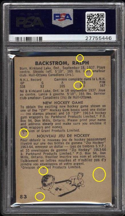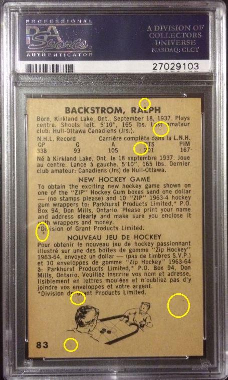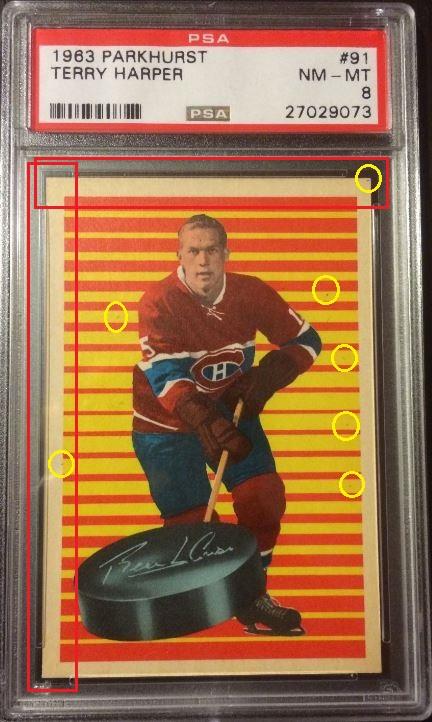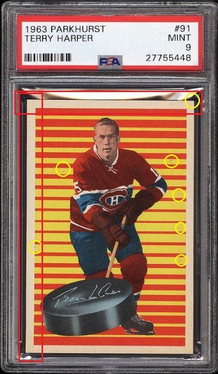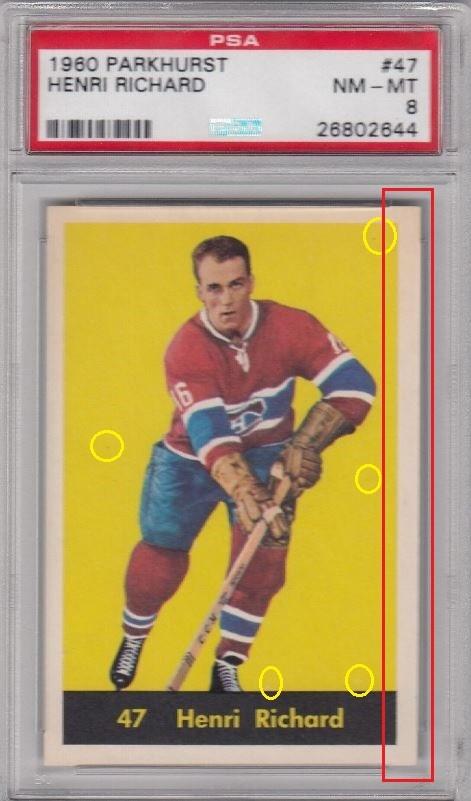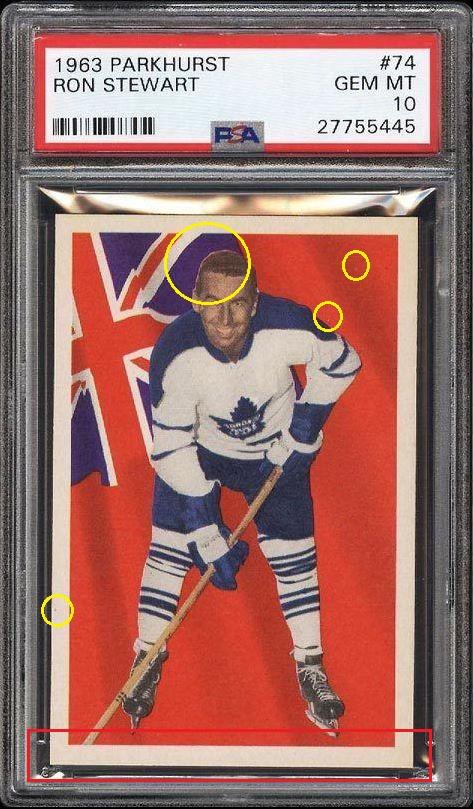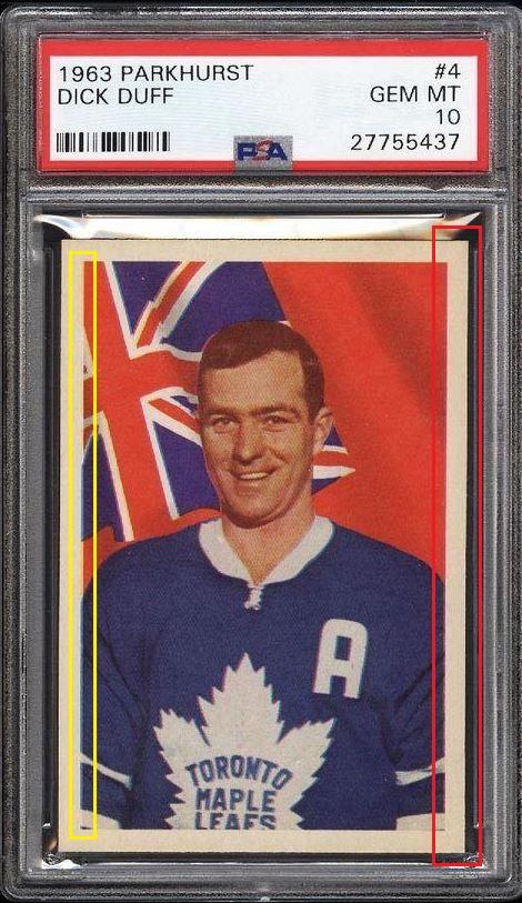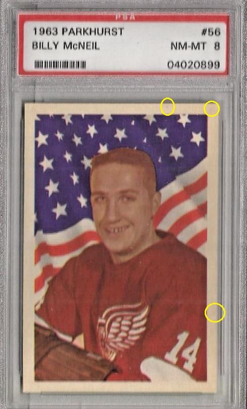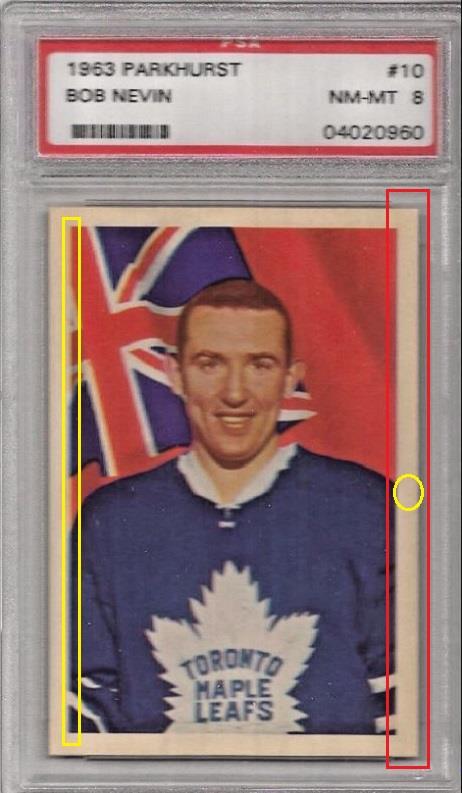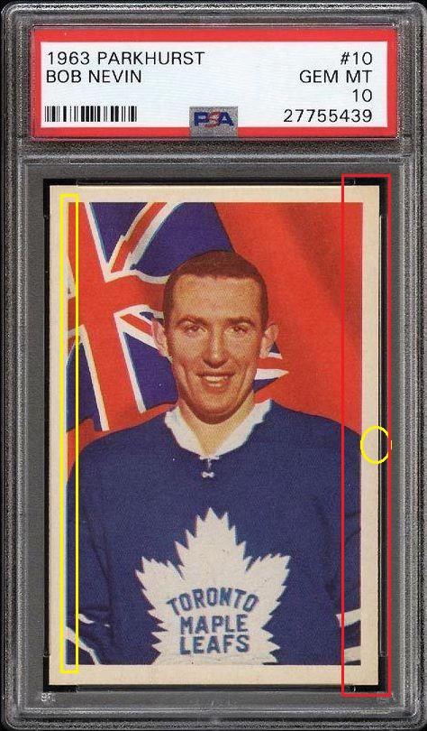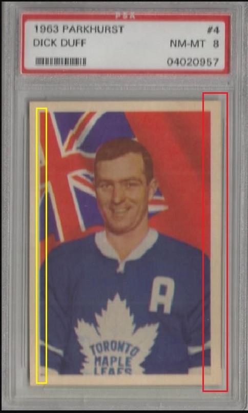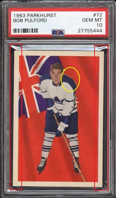 It took me a while to figure this one out (I think). I came across this string of vintage graded PSA 10s several weeks ago and couldn't pin down who submitted them. I have typically seen the usual masked VCP ID of b***y when I find the before purchases, but it wasn't the case this time. The submission numbers in the cards that I am about to post begin with 27755431 and end with 27751452 and total 21 cards. There are three different initial VCP purchase IDs involved that include an unknown Ebay ID with the masked Ebay ID of 9***9 and VCP masked ID of e***c, and an unknown Ebay ID with a masked Ebay ID of p***e and a matched VCP masked ID of p***e and a VCP masked ID of t***9 . While I cannot confirm a link between the three, they do seem to be from the same submission and all of the after sales were through PWCC with many being sold on the same date. The majority of the posted card images have poor first sale scans or only a front scan that I could not 100% confirm a match. I posted the first scans that I am confident are a match. In a sequentially numbered stretch of 21 PSA certs, there are 13 vintage PSA 10s - most trimmed and the others with no prior sale found. In that 21 card range there were 10 consecutive 10s given by PSA's experts. I believe the odds of that occurring with 50+ year old trimmed cards is astronomical without insider assistance from within PSA. Any help in identifying these three masked VCP ID's would be greatly appreciated. The cards are as follows: #27755431 - PSA 10 - 1960 Parkhurst Jack McIntyre #24 Could not find a prior sale. Sold by PWCC on 11/27/17 for $2,024.00. #27755432 - PSA 9 - 1960 Parkhurst Barry Cullen #32 Could not find a prior sale. Sold by PWCC on 10/26/17 for $88.66. #27755433 - PSA 9 - 1960 Parkhurst Henri Richard #47 Purchased by e***c on 6/12/17 as a PSA 8 for $250.00. Sold by PWCC on 10/26/17 for $379.00. Only a front scan provided. Trimmed on right edge. PSA Set Registry: George's Gems ![]() ![]() #27755434 - PSA 9 - 1961 Topps Murray Balfour #33 No sale record in VCP. #27755435 - PSA 8 - 1961 Topps Doug Harvey #45 Could not find a prior sale. Sold by PWCC on 10/26/17 for $59.00. #27755436 - PSA 9 - 1962 Parkhurst Jean Beliveau #39 Purchased by e***c on 12/01/16 as a PSA 8 for $110.95. No sale record on VCP. #27755437 - PSA 10 - 1963 Parkhurst Dick Duff #4 Purchased by e***c on 03/27/17 as a PSA 8 for $36.00. Sold by PWCC on 11/27/17 for $561.00. Poor first scan. Borders and mis-registered colors match (not 100% though). Trimmed right edge. PSA Set Registry: George's Gems ![]() ![]() #27755438 - PSA 10 - 1963 Parkhurst Ed Litzenberger #6 Purchased by e***c on 03/27/17 as a PSA 8 for $30.00. Sold by PWCC on 11/27/17 for $235.50. Poor first scan. Borders, smudges, and mis-registered colors match (not 100% though). Trimmed left and bottom edges. PSA Set Registry: private ![]() ![]() #27755439 - PSA 10 - 1963 Parkhurst Bob Nevin #10 Purchased by e***c on 03/27/17 as a PSA 8 for $36.00. Sold by PWCC on 11/27/17 for $787.00. Poor first scan. Borders, smudge, and mis-registered colors match (not 100% though). Trimmed right edge. PSA Set Registry: George's Gems ![]() ![]() #27755440 - PSA 10 - 1963 Parkhurst Bob Pulford #12 Purchased by e***c on 05/23/17 as a PSA 8 for $30.00. Sold by PWCC on 11/27/17 for $257.00. Poor first scan. Borders, smudge, and mis-registered colors match (not 100% though). Trimmed right edge. PSA Set Registry: Martin the Erudicious Hockey Antiquarian ![]() ![]() #27755441 - PSA 10 - 1963 Parkhurst Pete Goegan #43 Purchased by e***c on 05/23/17 as a PSA 8 for $30.00. Sold by PWCC on 11/27/17 for $699.00. Poor first scan. Borders, smudge, print spots match (not 100% though). Trimmed left and right edges. PSA Set Registry: George's Gems ![]() ![]() #27755442 - PSA 10 - 1963 Parkhurst Billy McNeill #56 Purchased by e***c on 05/28/17 as a PSA 8 for $24.99. Sold by PWCC on 11/27/17 for $678.00. Poor first scan. Borders, smudge, print spots match (not 100% though). No conclusive evidence of trimming. PSA Set Registry: private ![]() ![]() #27755443 - PSA 10 - 1963 Parkhurst Kent Douglas #67 Could not locate a prior sale. Sold by PWCC on 11/27/17 for $777.00. PSA Set Registry: rjmjr ![]() #27755444 - PSA 10 - 1963 Parkhurst Bob Pulford #72 Purchased by e***c on 03/27/17 as a PSA 8 for $25.00. Sold by PWCC on 11/27/17 for $326.00. Poor first scan. Borders, smudge, print spots match (not 100% though). Trimmed left and right edges. PSA Set Registry: I've clearly gone INSANE! ![]() ![]() #27755445 - PSA 10 - 1963 Parkhurst Ron Stewart #74 Purchased by e***c on 03/20/17 as a PSA 8 for $38.00. Sold by PWCC on 11/27/17 for $1,236.00. Poor first scan. Borders, smudge, print spots match (not 100% though). Trimmed bottom edge. PSA Set Registry: George's Gems ![]() ![]() #27755446 - PSA 10 - 1963 Parkhurst Ralph Backstrom #83 Purchased by p***e on 03/20/17 as a PSA 8 for $38.00. Sold by PWCC on 11/27/17 for $372.00. Borders, smudge, print spots match. Trimmed left edge. PSA Set Registry: George's Gems ![]() ![]() ![]() ![]() #27755447 - PSA 9 - 1963 Parkhurst Jean Beliveau #89 No sale found. PSA Set Registry: none #27755448 - PSA 9 - 1963 Parkhurst Terry Harper #91 Purchased by p***e on 03/20/17 as a PSA 8 for $43.99. Sold by PWCC on 10/26/17 for $72.00. Good front and back scans to verify a match - only posted the front scan since there is enough to confirm a match. Borders, smudge, print spots match. Trimmed left and top edges. PSA Set Registry: none ![]() ![]() #27755449 - PSA 10 - 1963 Parkhurst Gump Worsley #98 No prior graded sale found. Sold by PWCC on 11/27/17 for $932.79. PSA Set Registry: none These hockey cards are some of the most egregious trim jobs I've seen posted on these boards, and that's saying a lot. The Richard is disgusting (kudos Corndog for uncovering these) It has me thinking that this stretches beyond mere incompetence in grading by PSA. |