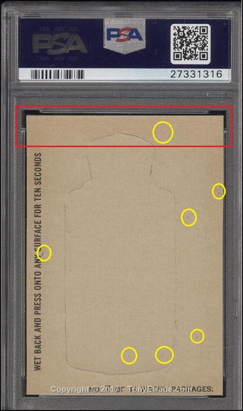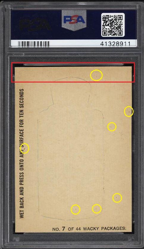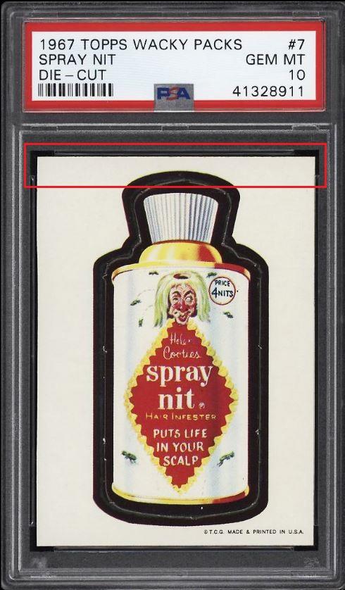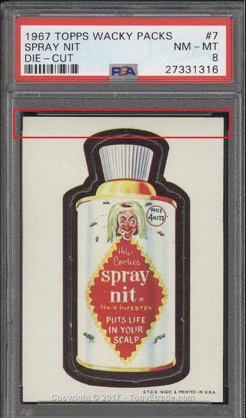 PSA Cert #41328911 1967 Wacky Packs Die Cut Spray Nit #7 Value gain of $660.49 This cert is currently in a private Set Registry inventory. This card was purchased by Ebay ID qut9 (Will Jaimet) from Ebay seller tonyetrade as a PSA 8 for $247.50 on May 22, 2018. VCP link: https://vintagecardprices.com/card/n...a/193981/PSA/8 Same card was sold by PWCC as a PSA 10 for $907.99 on November 20, 2018. PWCC Marketplace link: https://www.pwccmarketplace.com/items/1861432 Yellow circles are print, fiber, or chipping identifiers. Red box identifies trimmed top edge. ![]() ![]() ![]() ![]() ![]()