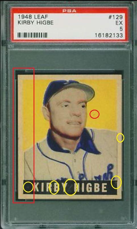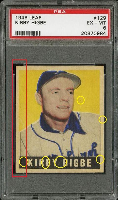 PSA Cert #20870984 1948 Leaf Kirby Higbe #129 Value gain of $386.49 This cert is currently in Set Registry inventory and is featured in one or more sets, including Steve Anderson. This card was purchased by whitman111 (Gary Moser) from Ebay seller www,stevenovella,com as a PSA 5 for $239.49 on October 24, 2012. VCP link: https://vintagecardprices.com/card/b...29/42337/PSA/5 Same card was sold by PWCC as a PSA 6 for $625.98 on October 05, 2014. PWCC Marketplace link: https://www.pwccmarketplace.com/items/1036682 Yellow circles are print, fiber, or chipping identifiers. Red box identifies trimmed left edge. No back image provided. ![]()