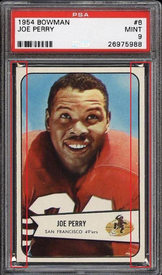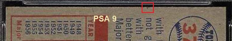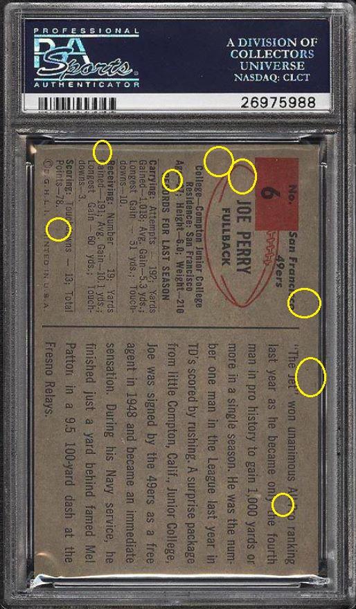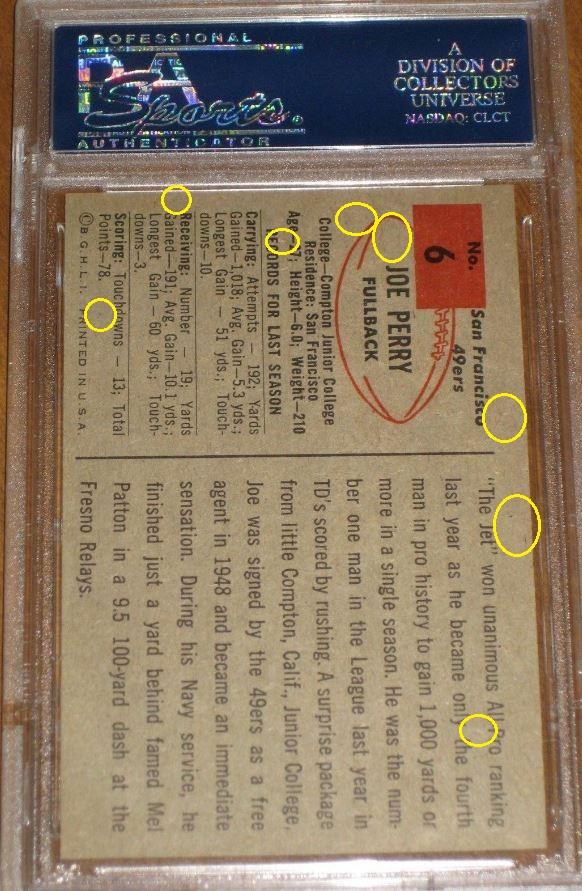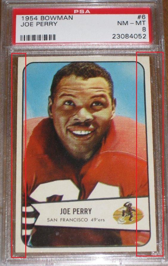 1954 Bowman Joe Perry #6 Value gain of $327.58 PSA Set Registry: TheBartholomewCollection This card was purchased by masked VCP ID m***h (Johnny Adams, Jr.) from Ebay seller m.sassin as a PSA 8 for $59.00 on March 26, 2016. Same card was sold by PWCC as a PSA 9 for $386.58 on April 25, 2017. Yellow circles are print, fiber, or chipping identifiers. Red boxes identify trimmed left and right edges. ![]() ![]() ![]() ![]() ![]() ![]()