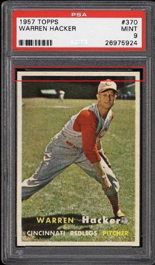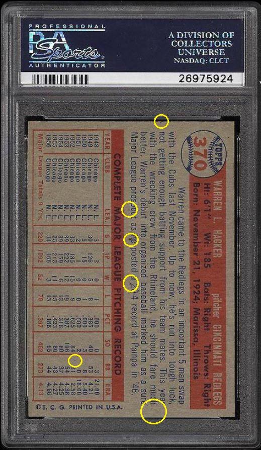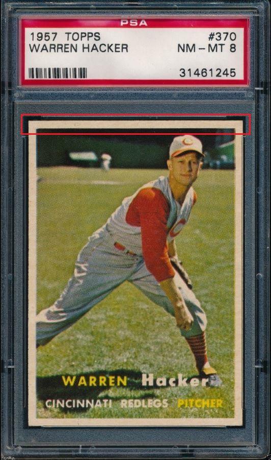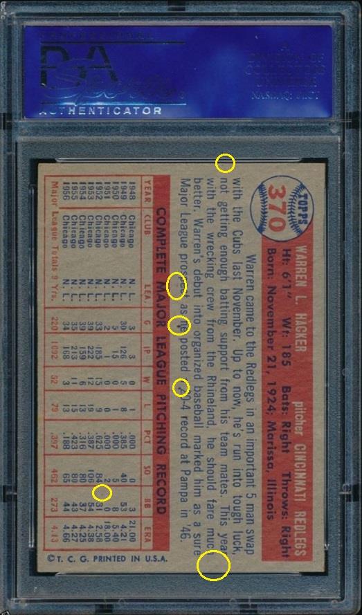 1957 Topps Warren Hacker #370 Value gain of $785.43 PSA Set Registry: private This card was purchased by masked VCP ID m***h (Johnny Adams, Jr.) from Ebay seller tsc*c as a PSA 8 for $62.57 on October 26, 2016. Same card was sold by PWCC as a PSA 9 for $848.00 on April 12, 2017. Yellow circles are print, fiber, or chipping identifiers. Red box identifies trimmed top edge. ![]() ![]() ![]() ![]() ![]() ![]()
