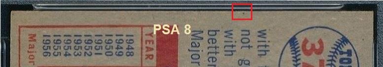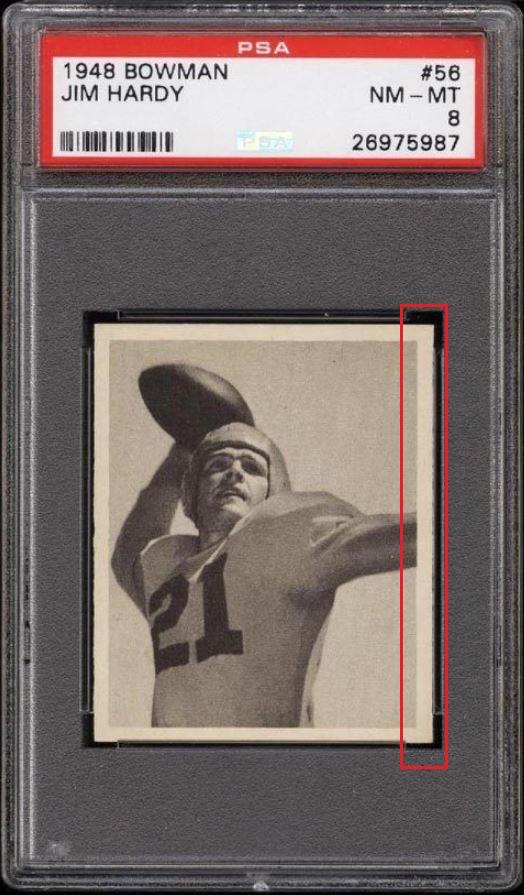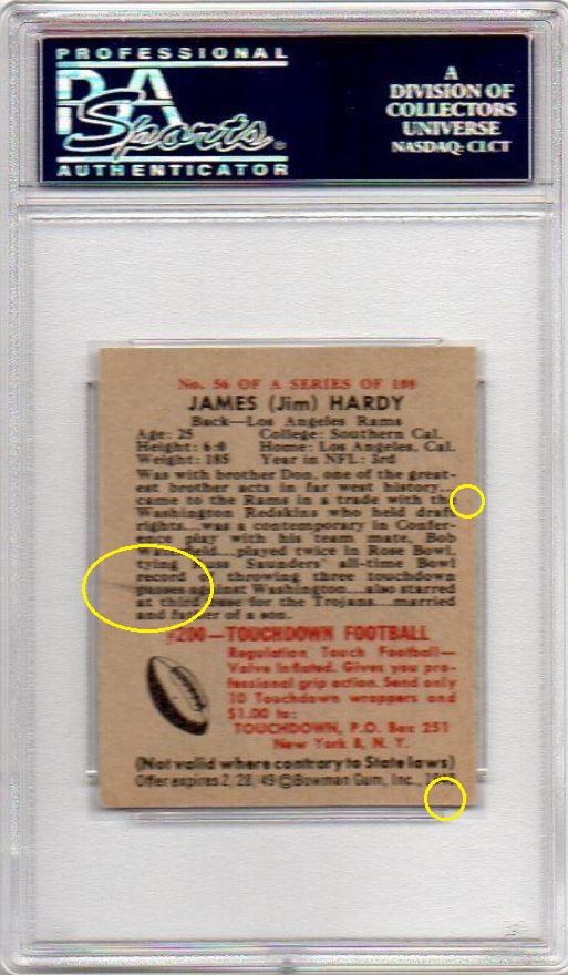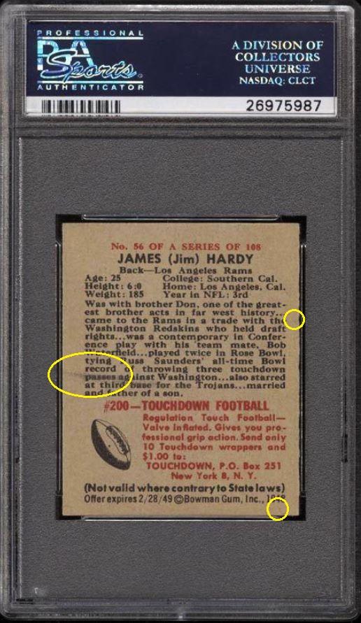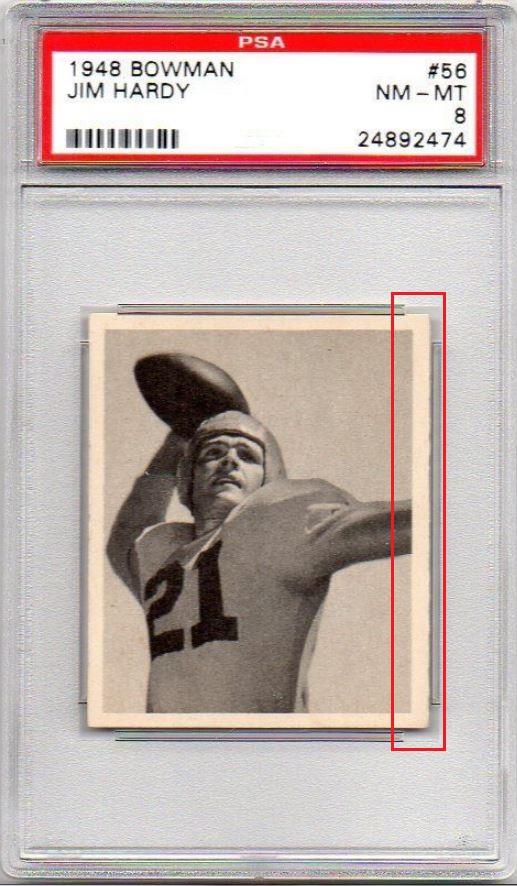 1948 Bowman Jim Hardy #56 Value gain of $29.50 PSA Set Registry: JRM 1948 Bowman This card was purchased by masked VCP ID m***h (Johnny Adams, Jr.) from Ebay seller hanks_haberdashery as a PSA 8 for $83.00 on January 28, 2016. Same card was sold by PWCC as a PSA 8 for $112.50 on May 17, 2017. Yellow circles are print, fiber, or chipping identifiers. Red box identifies trimmed right edge. ![]() ![]() ![]() ![]()