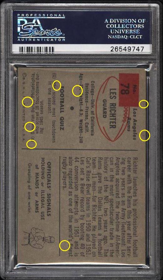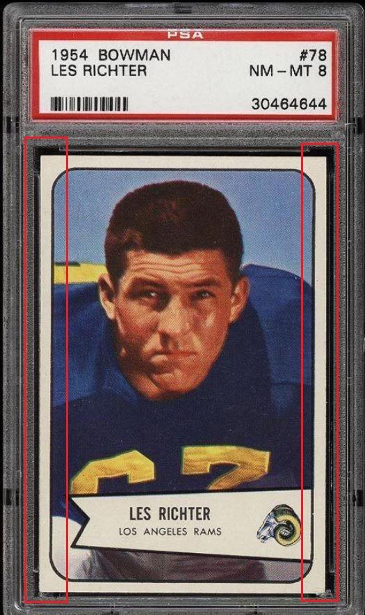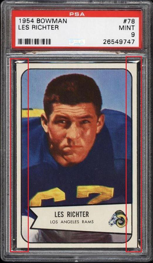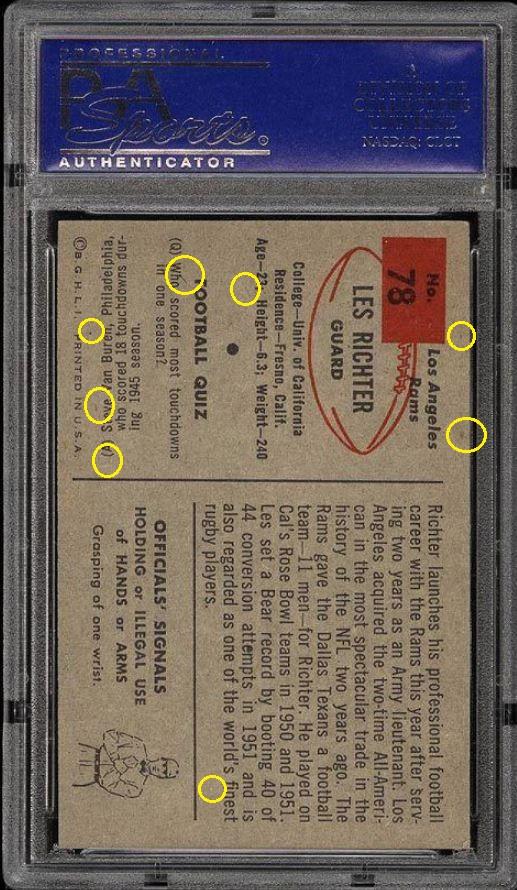 1954 Bowman Les Richter #78 Value gain of $153.46 PSA Set Registry: Nellie's 1954 Bowman FB This card was purchased by masked VCP ID m***h (Johnny Adams, Jr.) from Ebay seller PWCC as a PSA 8 for $65.99 on April 24, 2016. Same card was sold by PWCC as a PSA 9 for $219.45 on March 22, 2017. Yellow circles are print, fiber, or chipping identifiers. Red boxes identify trimmed left and right edges. ![]() ![]() ![]() ![]() ![]() ![]()