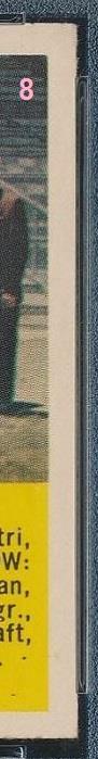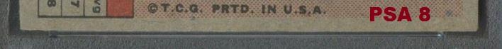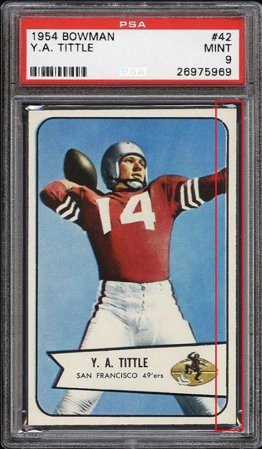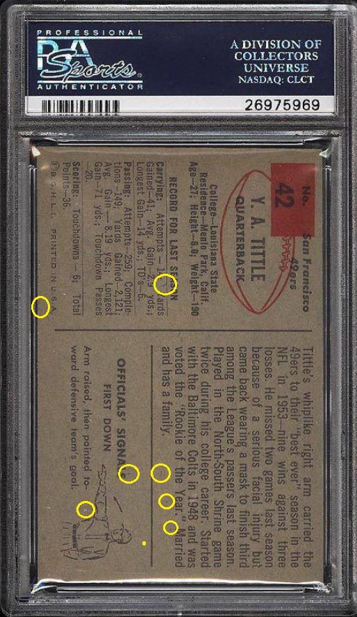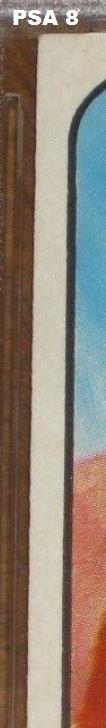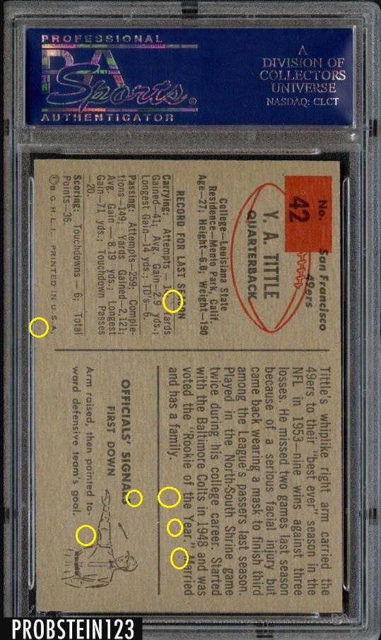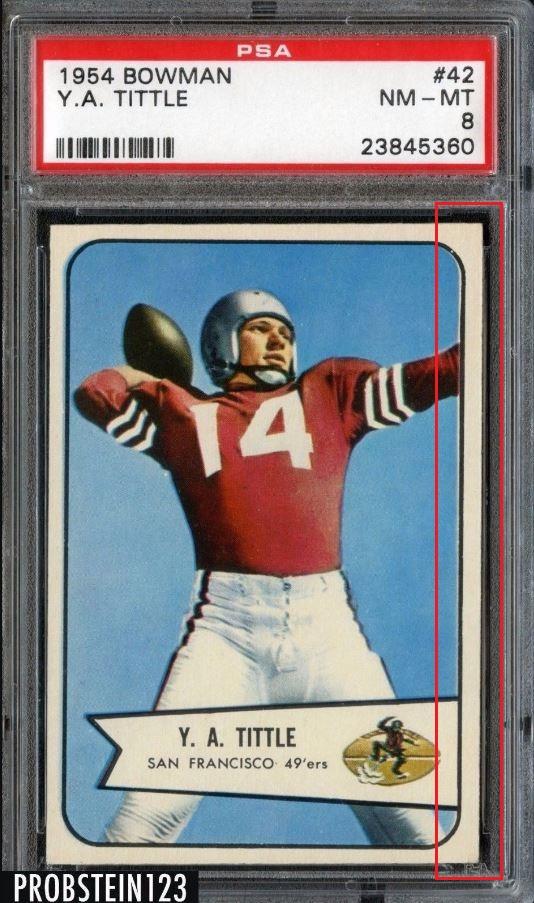 1954 Bowman Y.A. Tittle #42 Value gain of $1,403.00 PSA Set Registry: none found This card was purchased by masked VCP ID m***h (Johnny Adams, Jr.) from Ebay seller probstein123 as a PSA 8 for $167.00 on April 26, 2016. Same card was sold by PWCC as a PSA 9 for $1,570.00 on April 25, 2017. Yellow circles are print, fiber, or chipping identifiers. Red box identifies trimmed right edge. ![]() ![]() ![]() ![]() ![]() ![]()