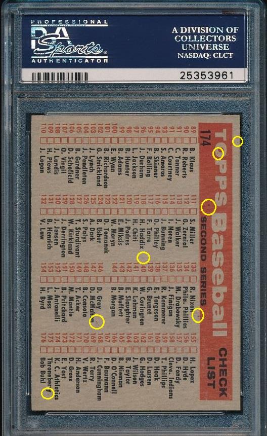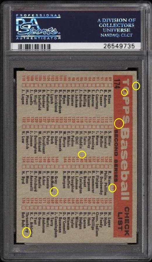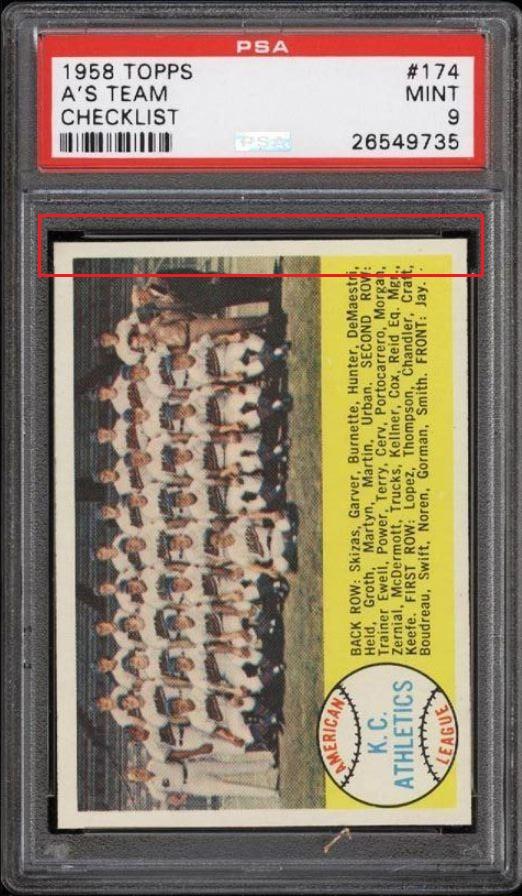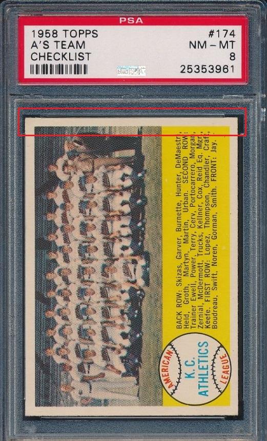 1958 Topps Kansas City Athletics #174 Value gain of $254.01 PSA Set Registry: none found This card was purchased by masked VCP ID m***h (Johnny Adams, Jr.) from Ebay seller stevenovella as a PSA 8 for $76.99 on July 13, 2016. Same card was sold by PWCC as a PSA 9 for $331.00 on February 09, 2017. Yellow circles are print, fiber, or chipping identifiers. Red box identifies trimmed right edge. ![]() ![]() ![]() ![]()