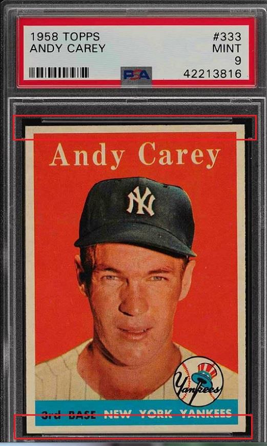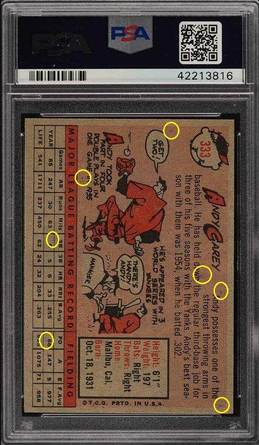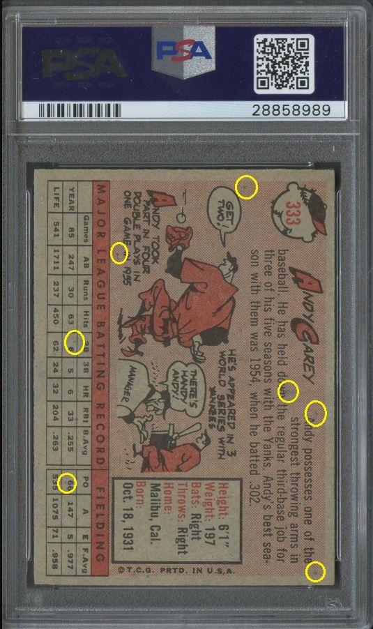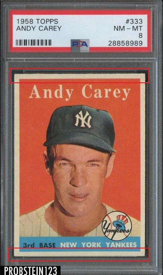 1958 Topps Andy Carey #333 Value gain of $153.40 PSA Set Registry: Stevenson collection This card was purchased by masked VCP ID m***h (Johnny Adams, Jr.) from Ebay seller Probstein123 as a PSA 8 for $52.10 on April 10, 2018. Same card was sold by PWCC as a PSA 9 for $205.50 on April 10, 2019. Yellow circles are print, fiber, or chipping identifiers. Red boxes identify trimmed top and bottom edges. ![]() ![]() ![]() ![]() ![]() ![]() ![]()