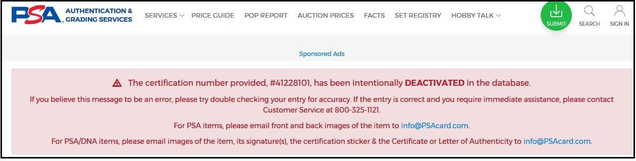 Interesting development, the altered card shown below from Dec 2019 and outed by Superdan, cert #41228101, has been deactivated by PSA...