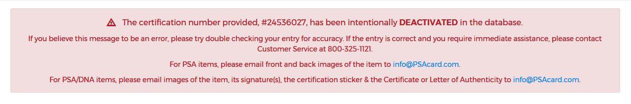 have been intentionally deactivated by PSA from the database. The cert #s that have been deactivated were never mentioned in this thread. The smattering of cards that are still active in this cert run appear to be grade bumps only.