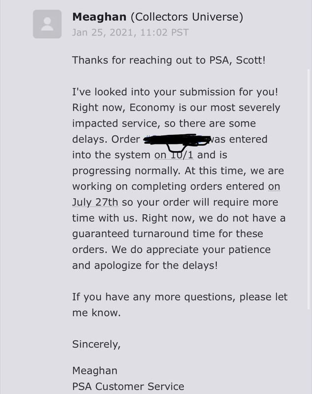 Yeah first order 6/15 receive by psa deleivered to me Nov 22 (77 cards). Next order received by PSA 7/16 (110 cards) still stuck in grading as of today. Also have a value - modern received by PSA 7/22 (117 cards) and thats still stuck in grading as well. Just seems weird that only a month a part in ship dates but now over 2 months apart on receive end and counting. Even factoring holidays still month and 1/2 and counting.